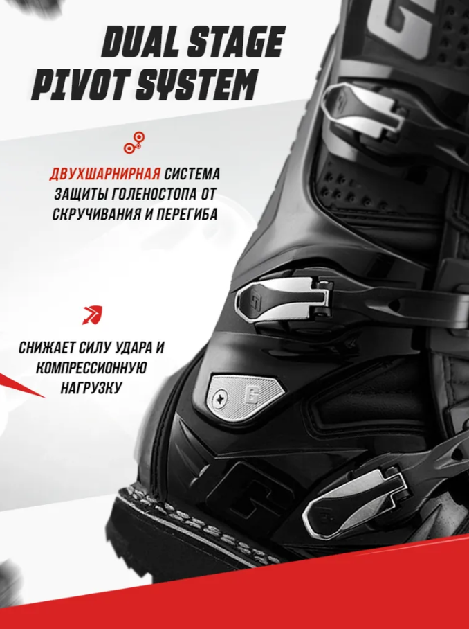 Еще более длительных срок эксплуатации, большая степень комфорта, естественная подвижность ноги, возможность идеальной подгонки по ноге, защита нового поколения – все это делает SG-12 лучшим выбором любителей и профессионалов мотокросса по всему миру.