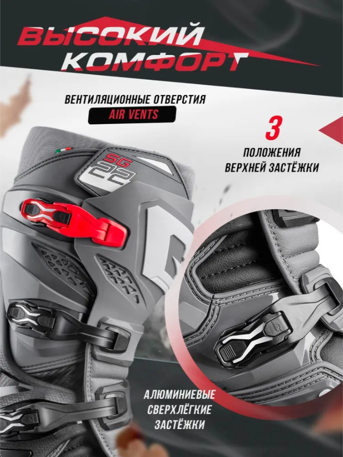 Мотоботы Gaerne SG22 — профессиональная экипировка для победителей, созданная с применением инновационных технологий итальянского бренда. Эти ботинки разработаны для гонщиков, стремящихся к максимальным результатам. Технологичные особенности: • Алюминиевые застёжки Aluminium Superlight Buckles — облегчённая конструкция с новой окраской, верхняя застёжка регулируется в 3 положениях • Система вентиляции Air Vents — эффективный отвод тепла и влаги в сочетании с усовершенствованной подкладкой • 3D накладка на носке Main Body Toe Box — снижает высоту на 9 мм для более быстрого переключения передач • Регулируемый щиток голени Frontal Shin Guard — 2 положения регулировки, совместимость с наколенниками • Облегчённый стальной бампер Steel Bumper 1 — матовая поверхность, уменьшенная толщина без потери защиты Защитные системы: • Покрытие Grip Guard 1 — разработано совместно с гонщиками для оптимального контроля мотоцикла • Подошва Dual Density Sole — двойная плотность для сцепления и амортизации • Технология Razorback — улучшенная подвижность голеностопа • Двухшарнирная система Dual Stage Pivot System — защита от травм лодыжки • Амортизирующая пятка G-Microshock Heel Pad — поглощение микроударов Рекомендации по подбору размера: • Используйте официальную размерную сетку Gaerne • Для широкой стопы может потребоваться размер больше • В описании указаны ориентировочные соответствия российским размерам • Рекомендуем примерку при возможности Производство: Сделано в Италии с соблюдением традиционных стандартов качества Gaerne. Эти мотоботы сочетают последние технологические разработки с проверенным итальянским качеством изготовления. Мотоботы Gaerne SG22 — это выбор профессионалов, созданный для тех, кто не ищет компромиссов между защитой, комфортом и спортивными результатами.