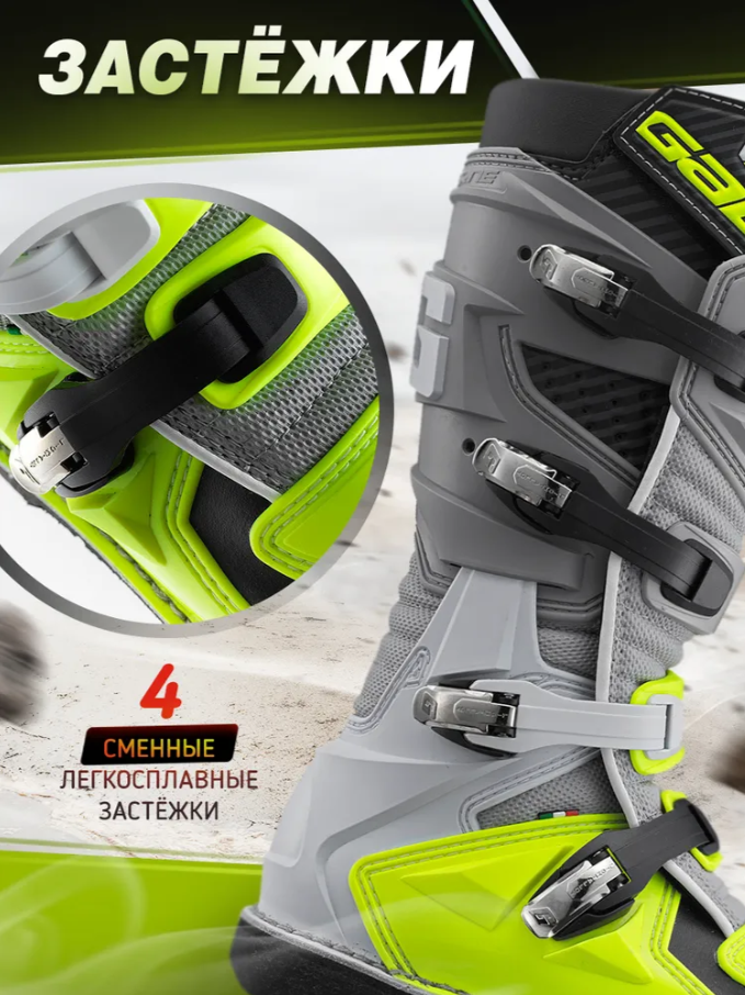 Мотоботы Gaerne GXJ — профессиональная кроссовая обувь 2025 года, специально разработанная для детей и женщин. Итальянский бренд Gaerne, известный своими традициями качества, создал идеальную модель для юных райдеров и женщин-мотоциклисток. Ключевые преимущества: • Специальная анатомическая колодка для детской/женской ноги • Усиленная защита по сравнению с предыдущей моделью SGJ • Улучшенная система застежек • Сочетание безопасности и комфорта Технологии и защита: • Уникальная система боковых пластиковых усилителей • Прочный кожаный верх • Полиуретановые защитные накладки • Теплозащитные экраны в зонах контакта • Анатомические пеновые вставки для фиксации лодыжки • Микрофибровая подкладка для комфорта Система фиксации: • 4 надежные застежки из легкого сплава • Регулировка верхних креплений по объему голени • Оптимальное распределение нагрузки Производство: Изготовлено в Италии с соблюдением традиционных стандартов качества Gaerne. Эти мотоботы — отличный выбор для тех, кто ценит безопасность, комфорт и проверенное итальянское качество.