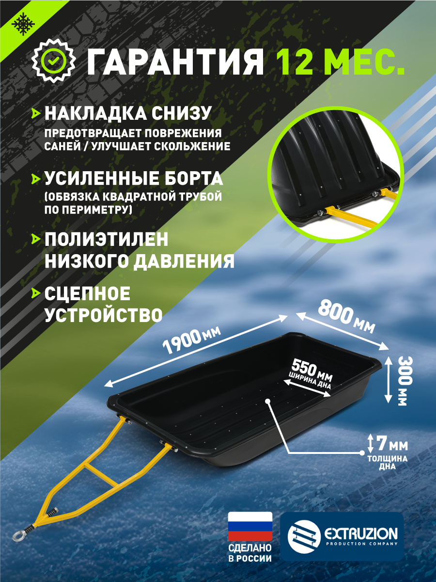 - Крупногабаритные сани-прицеп для профессионального использования с снегоходами и мотобуксировщиками. Увеличенная длина 1900 мм обеспечивает повышенную вместимость для перевозки объемных грузов. Изготовлены из сверхпрочного ПНД с УФ-стабилизацией. Полная комплектация сцепным устройством и стропами обвязки.
