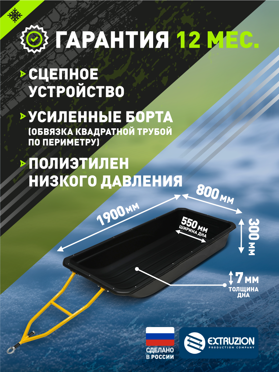 - Крупногабаритные сани-прицеп для профессионального использования с снегоходами и мотобуксировщиками. Увеличенная длина 1900 мм обеспечивает повышенную вместимость для перевозки объемных грузов. Изготовлены из сверхпрочного ПНД с УФ-стабилизацией. Полная комплектация сцепным устройством и стропами обвязки.