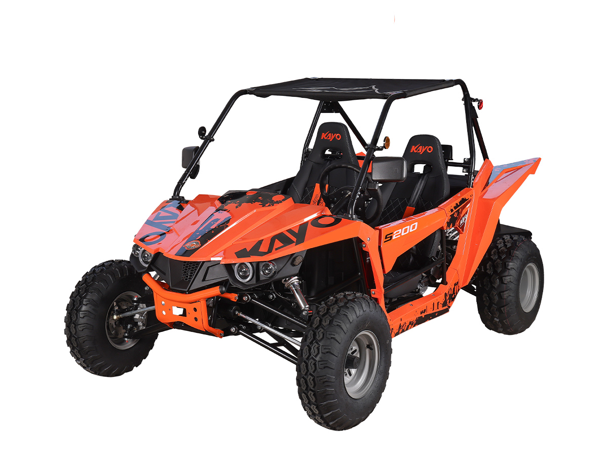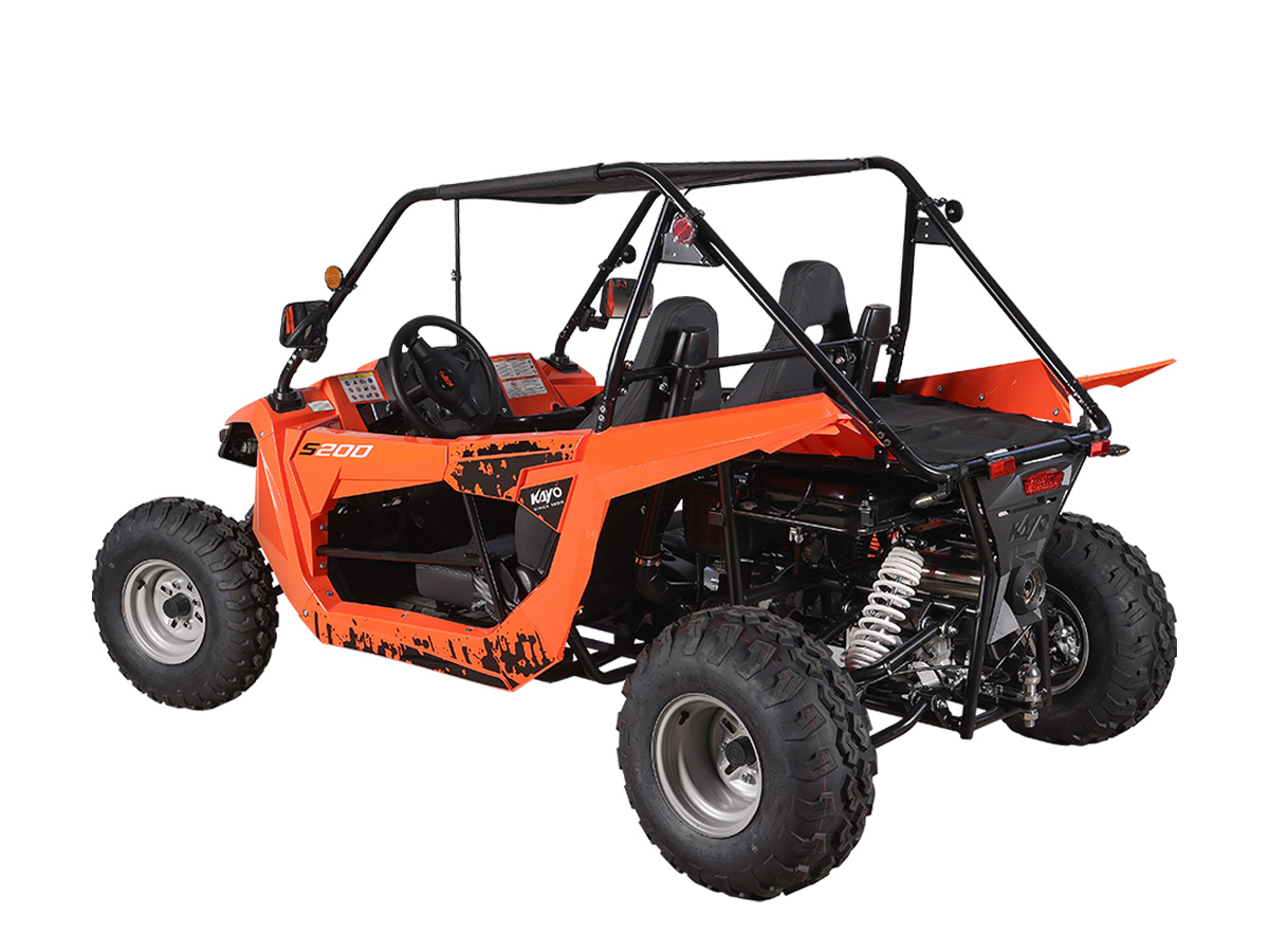 Среди конструктивных особенностей необходимо отметить мощную раму оригинальной разработки, которая обеспечивает прочность и долговечность конструкции. Облицовка багги выполнена из прочного пластика, а крыша из износостойкого мягкого материала. Также имеется электронная приборная панель с информативным ЖК-экраном, обрезиненные рулевое колесо и рычаг ручного тормоза, которые позволят райдеру мгновенно реагировать на изменения дорожных условий и маневрировать в любых ситуациях. KAYO S200 идеально подходит для поездок за город в поисках приключений или для семейного отдыха.