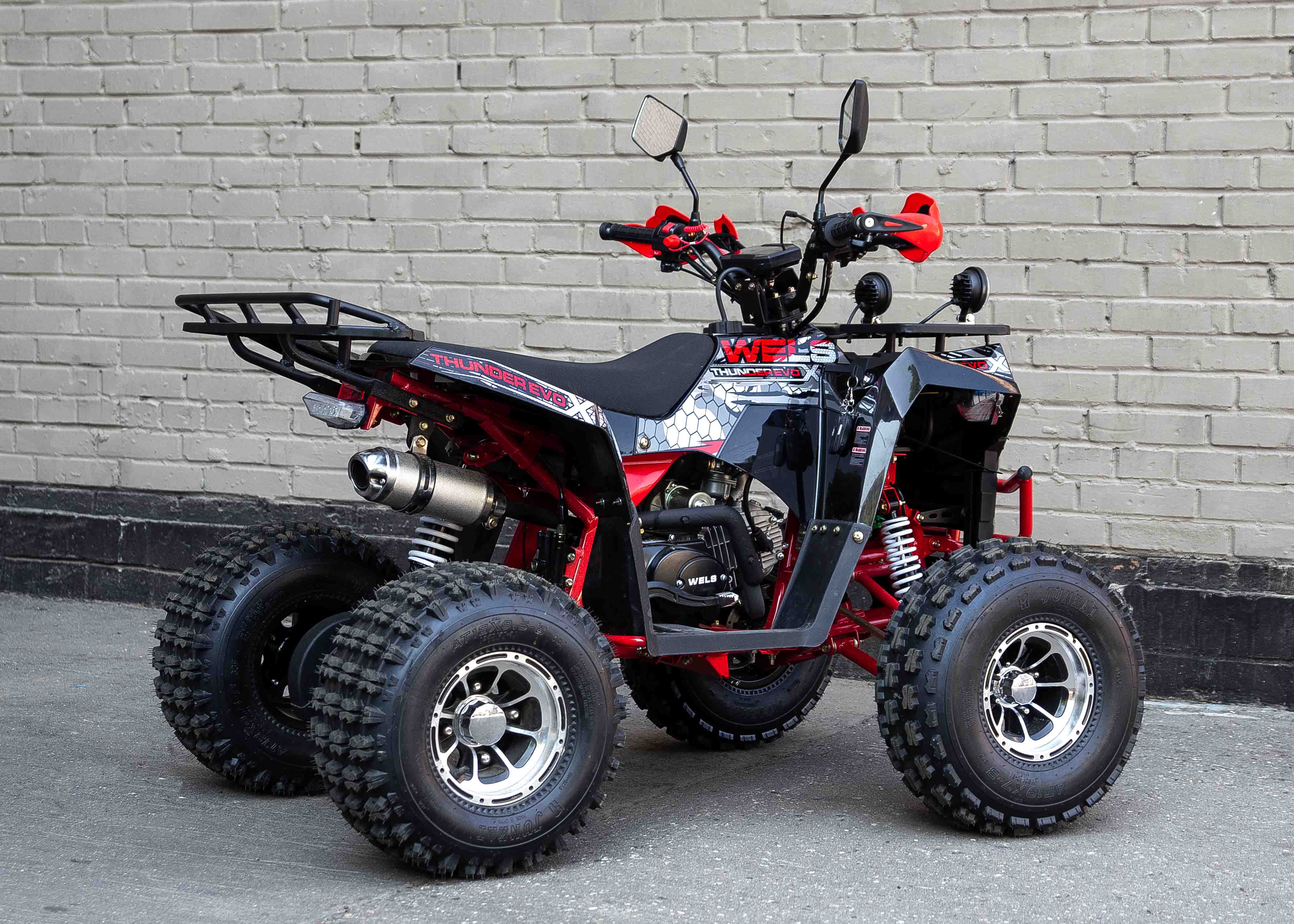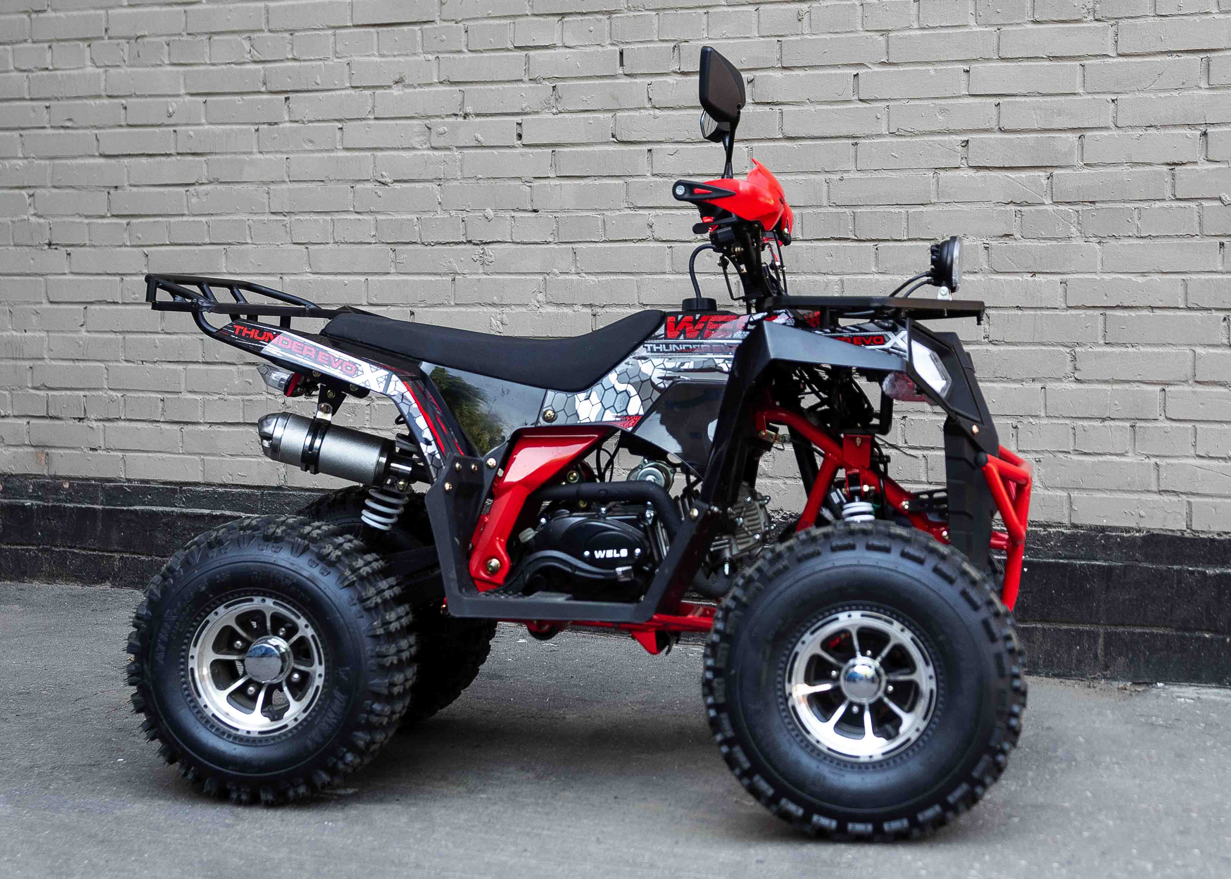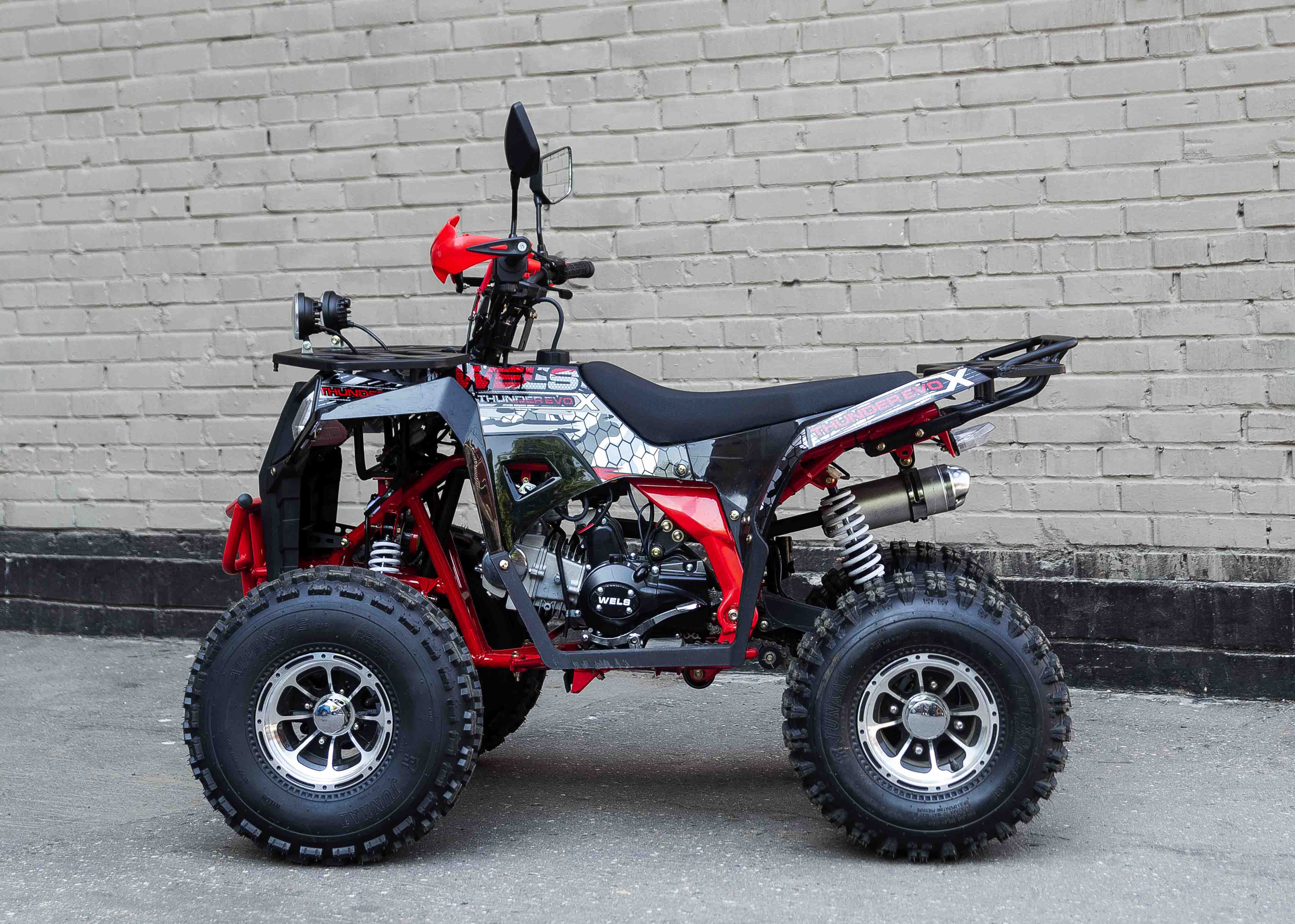 Стильная современная новинка 2019 года от компании WELS - квадроцикл для детей и подростков WELS THUNDER EVO X 125 предназначен для детей и подростков и обладает всеми необходимыми характеристиками, чтобы ребенок чувствовал себя на рулем настоящего квадроцикла, а его родители при этом были бы спокойны за безопасность юного пилота. ЛЮКСовая версия отличается от обычной наличием зеркал, дополнительной светодиодной оптики, спортивным глушителем, также квадроцикл укомплектован песочной резиной. 125 кубового мотора вполне хватает для непоседливых гонщиков. Если же Вам кажется, что этого много - воспользуйтесь ограничителем скорости. Дисковые тормоза спереди и сзади обеспечат своевременную остановку перед препятствием. Защита рук в комплектации оградит ребенка от ударов веток и других помех. Песочная резина. Большие колеса 19,7-8, зад.: 18,9.5-8. Наличие укрепленных багажников спереди и сзади позволит установить на квадроцикл кофр и выезжать на природу с необходимым набором вещей и инструментов. Светодиодные фары для передвижения в темное время суток. Моточасы, светодиодные фары, звуковой сигнал, колпаки - все включено в комплектацию. Доступен в расцветках: черно-красный, бело-красный, живописно-красный, зеленый камуфляж