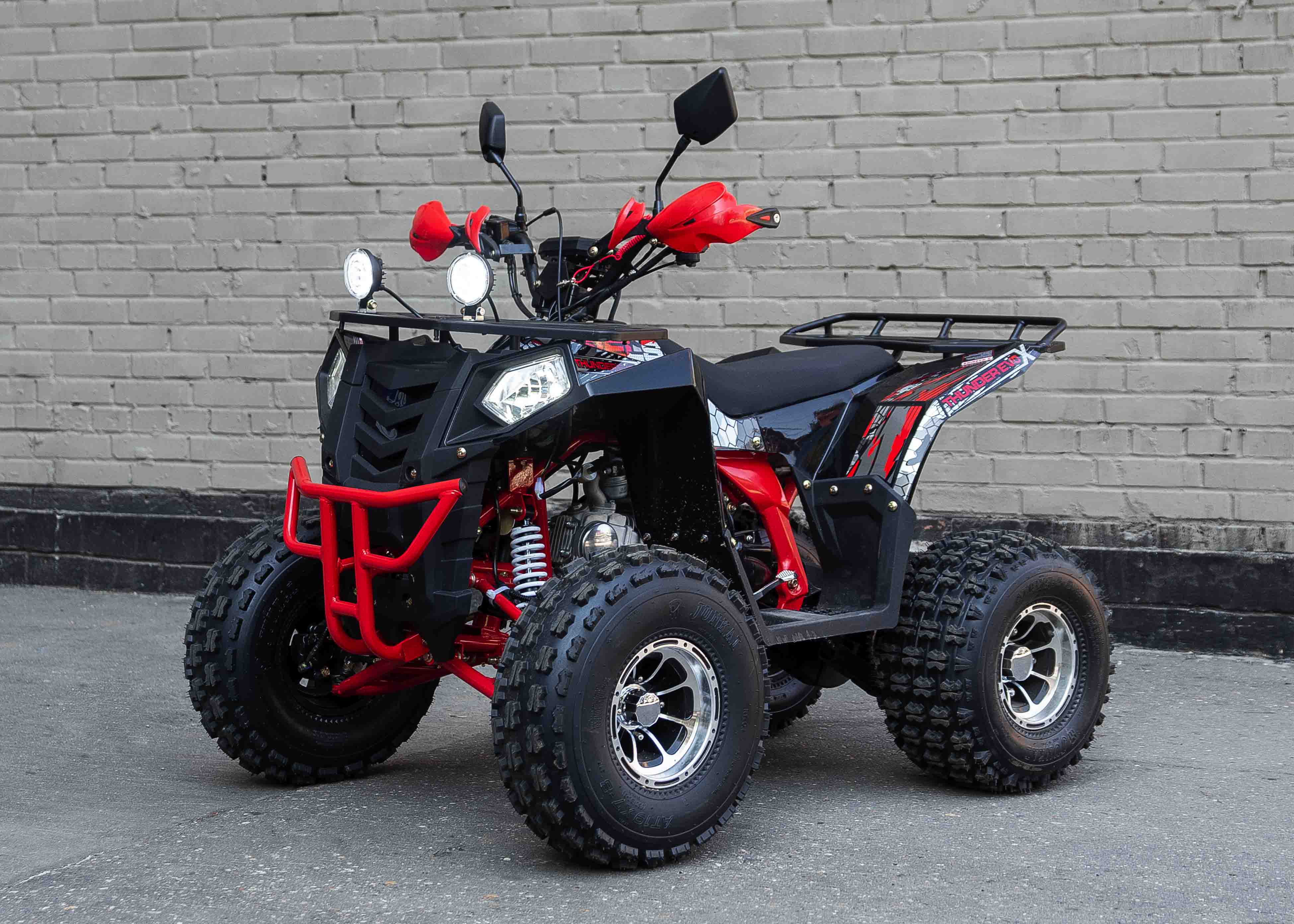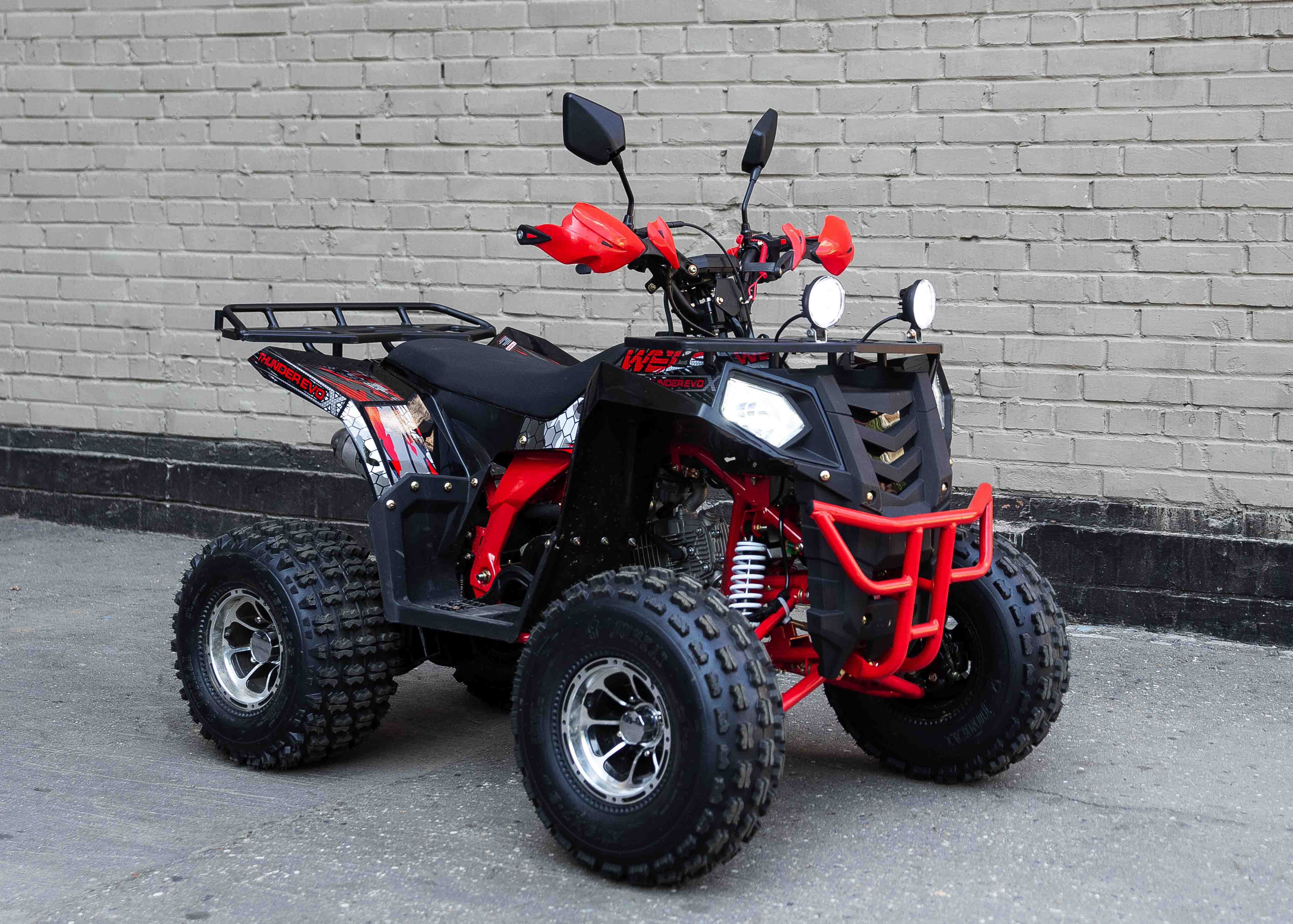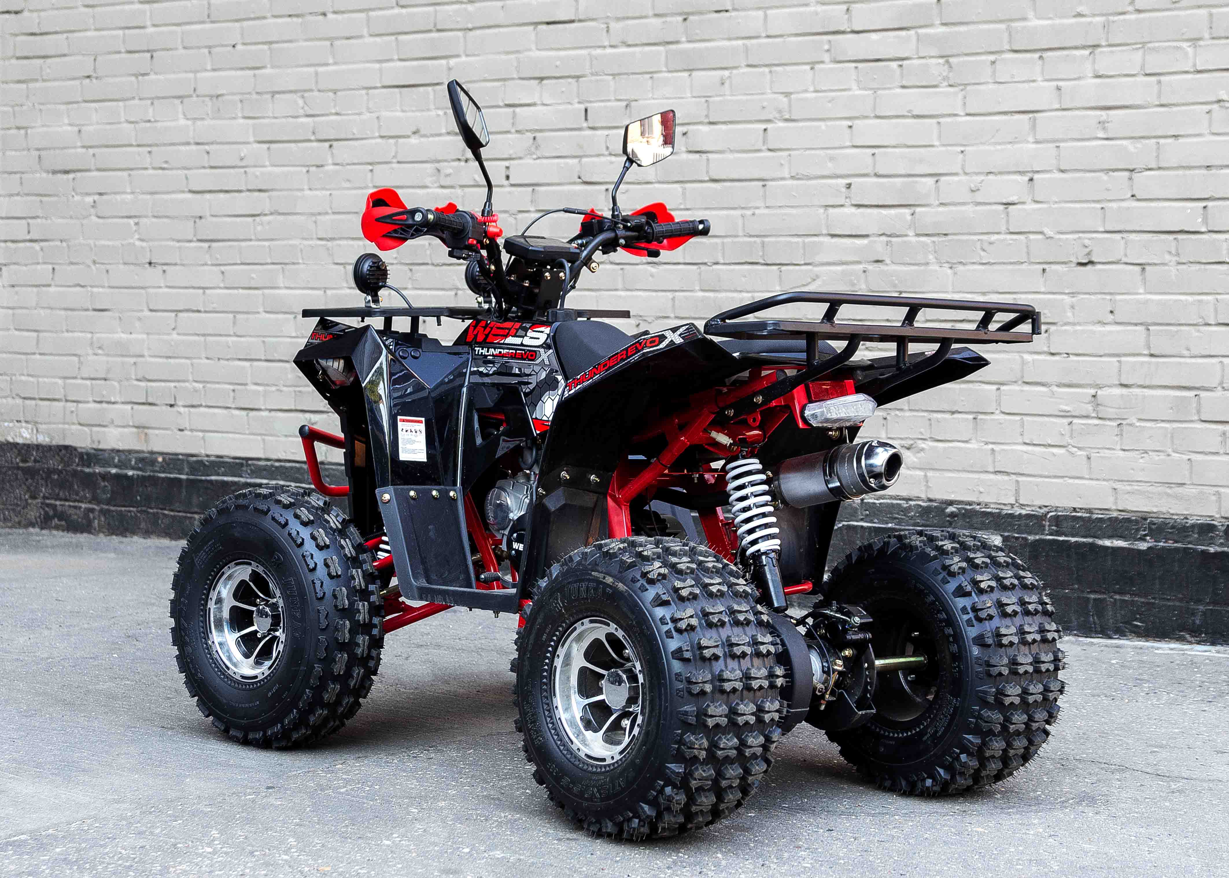 Стильная современная новинка 2019 года от компании WELS - квадроцикл для детей и подростков WELS THUNDER EVO X 125 предназначен для детей и подростков и обладает всеми необходимыми характеристиками, чтобы ребенок чувствовал себя на рулем настоящего квадроцикла, а его родители при этом были бы спокойны за безопасность юного пилота. ЛЮКСовая версия отличается от обычной наличием зеркал, дополнительной светодиодной оптики, спортивным глушителем, также квадроцикл укомплектован песочной резиной. 125 кубового мотора вполне хватает для непоседливых гонщиков. Если же Вам кажется, что этого много - воспользуйтесь ограничителем скорости. Дисковые тормоза спереди и сзади обеспечат своевременную остановку перед препятствием. Защита рук в комплектации оградит ребенка от ударов веток и других помех. Песочная резина. Большие колеса 19,7-8, зад.: 18,9.5-8. Наличие укрепленных багажников спереди и сзади позволит установить на квадроцикл кофр и выезжать на природу с необходимым набором вещей и инструментов. Светодиодные фары для передвижения в темное время суток. Моточасы, светодиодные фары, звуковой сигнал, колпаки - все включено в комплектацию. Доступен в расцветках: черно-красный, бело-красный, живописно-красный, зеленый камуфляж