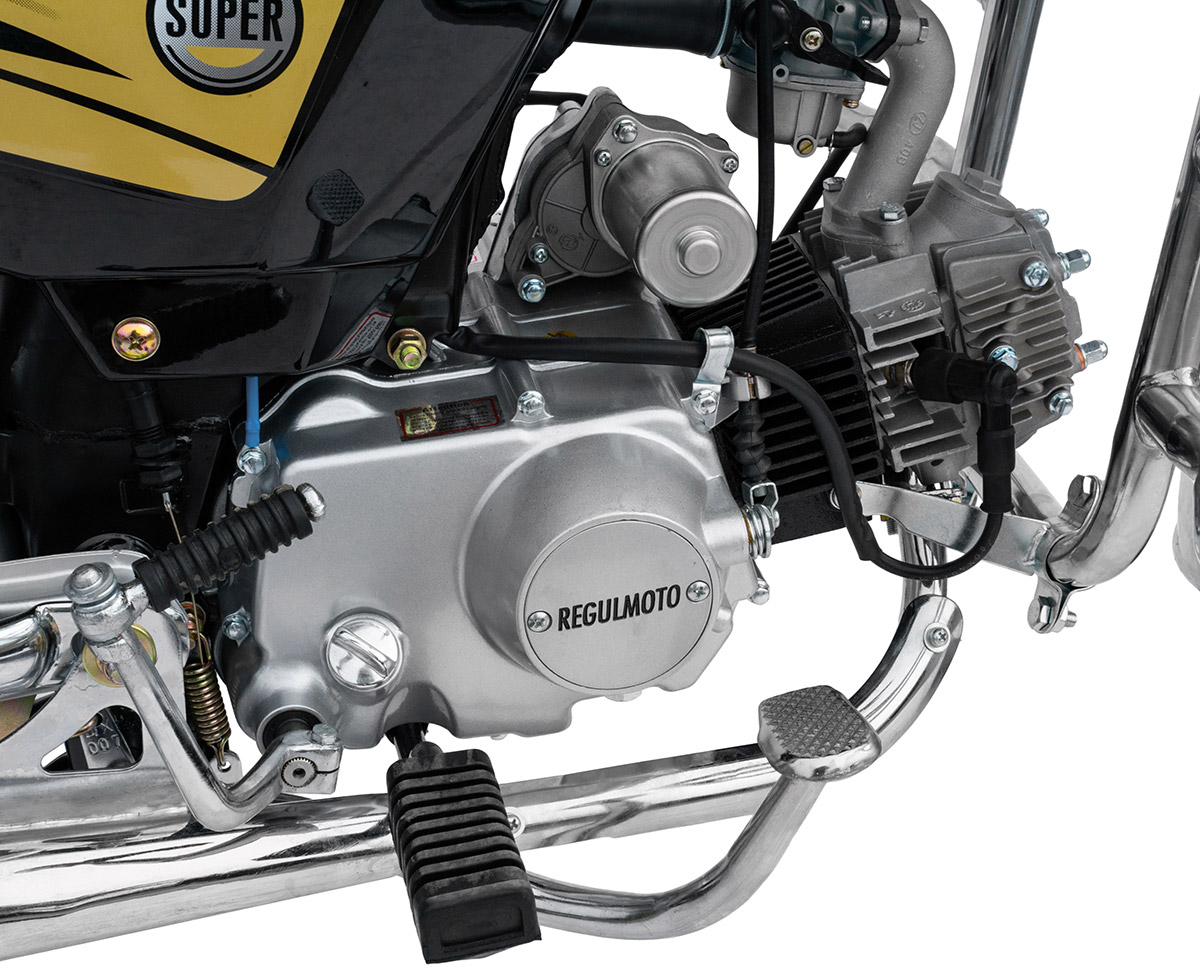 Данный мопед комплектуется надежным «кабовским» двигателем – одноцилиндровым 4-тактником воздушного охлаждения с 4-ступенчатой трансмиссией. Рабочий объем мотора увеличен до 110 см3 благодаря установке нового комплекта ЦПГ на заводе-изготовителе. Запуск двигателя возможно осуществить как при помощи кнопки электрострартера, так и при помощи рычага традиционного кик-стартера. Увеличение рабочего объема мотора заметно сказывается как на максимальной развиваемой мощности, которая составляет чуть больше семи лошадиных сил, так и на эксплуатационных характеристиках техники.