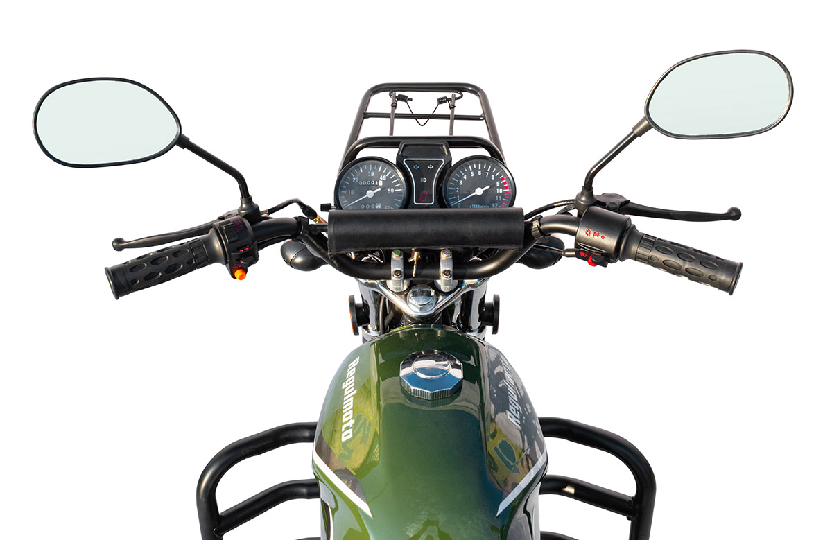 Regulmoto Alpha (RM-3) полностью готов к любым дорожным приключениям: мопед укомплектован светотехническим оборудованием, включающим переднюю фару с LED-лампой, задний стоп-сигнал, указатели поворотов. Также на руле мопеда установлены зеркала заднего вида и приборная панель, на которую выводятся показания спидометра, одометра, обороты двигателя, номер включенной передачи, индикаторы работы поворотников и фары.