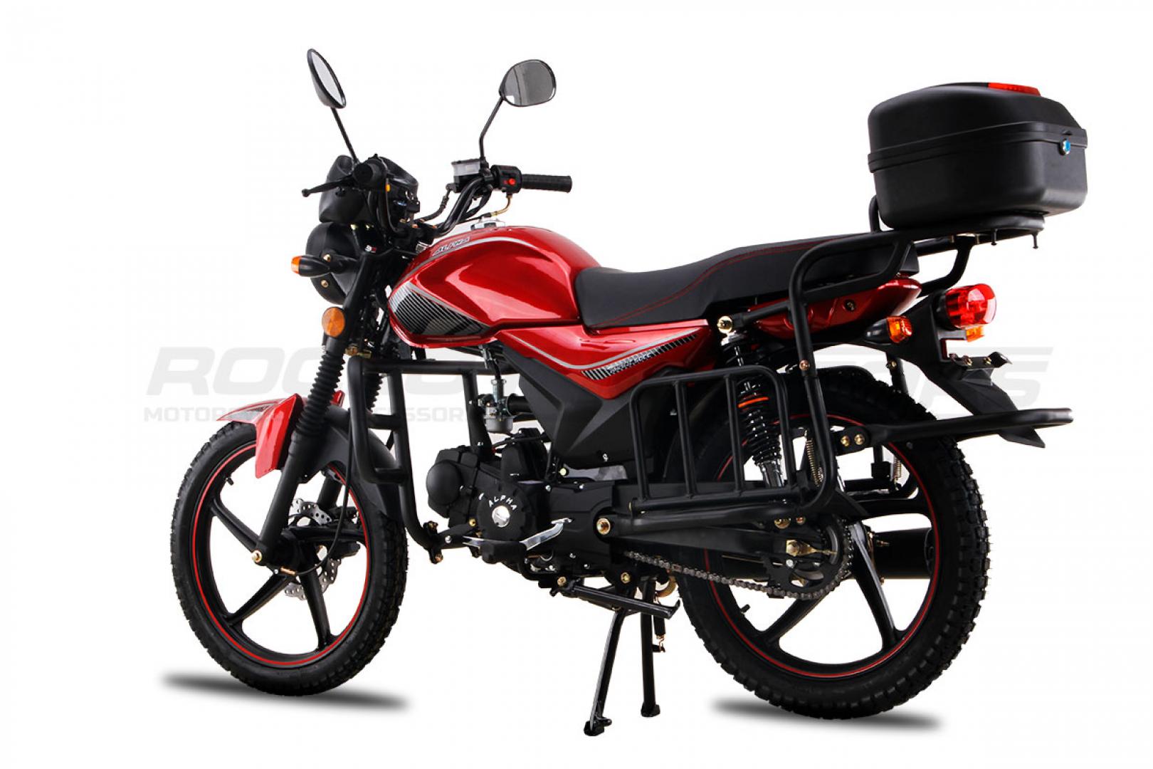 имеет объем 125 куб.см. Воздушного охлаждения, установлен электростартер. Мопед оснащен эргономичным пассажирским местом и вместительным багажником.