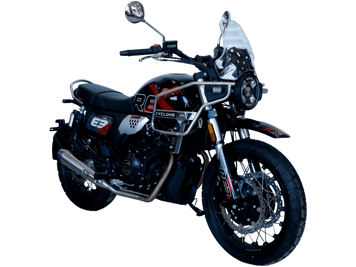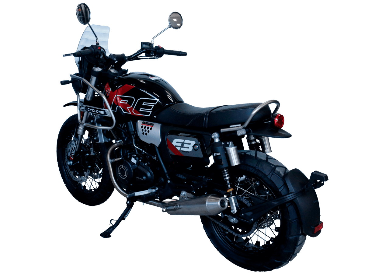 CYCLONE RE3 Scrambler (SR400-A) – универсальный мотоцикл, объединяющий в себе черты городского мотоцикла и эндуро. Управляя им, можно бросить вызов и городским пробкам, и скоростным автострадам, и всевозможному лёгкому бездорожью. Его дизайн отдаёт дань уважения каферейсерской тематике.