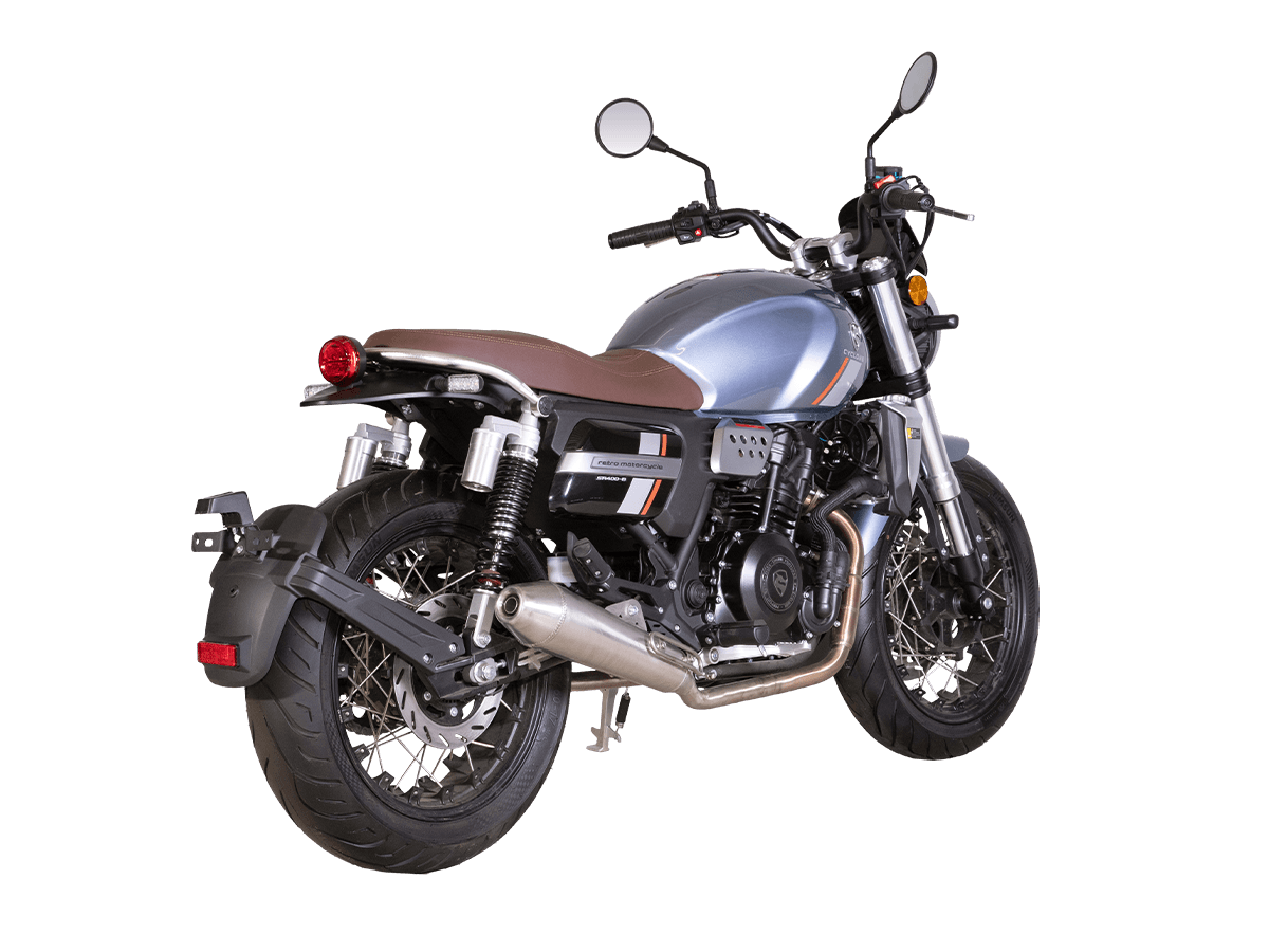 CYCLONE RE401 (SR400-B) 2024 – классик, в котором подчёркнутая простота объединяется с современными технологиями. Данная модель является более продвинутой версией модели RE3 (SR-400) – мотоцикл обладает более современным дизайном, снабжён стильными металлическими накладками на радиатор, а также топливным баком, объём которого увеличен до 20 литров.