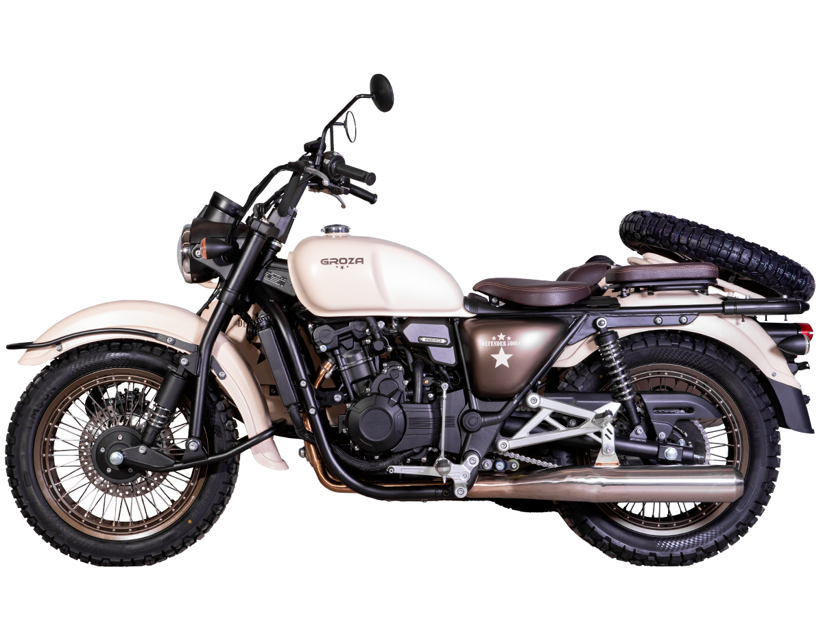 GROZA Defender 500 LC 4T EFI – легендарная модель, представляющая собой сайдкар в стиле ретро-милитари, и напоминающая культовый советский “Урал”. Байк оснащён изящными олдскульными фонарями и имеет покраску под фактуру некрашеного алюминия, как у истребителей 50-60 гг. Данная модификация является усовершенствованной моделью Defender 500 и оснащена гораздо более серьёзным мотором.