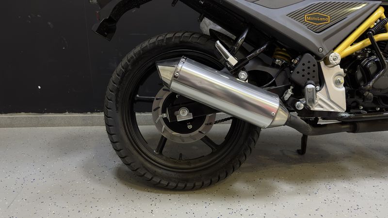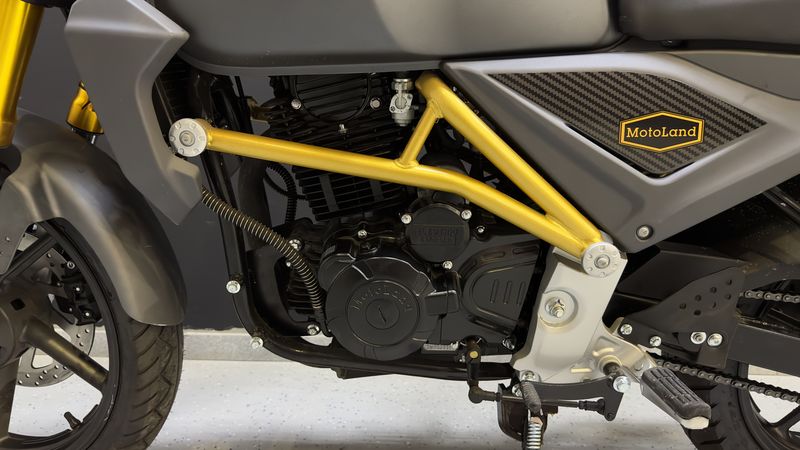 В мотоцикле MOTOLAND SCRAMBLER 250 установлен двигатель YX 165FMM, одноцилиндрового типа. В данной модели присутствует воздушное охлаждение. Доржник SCRAMBLER 250 оснащен пятиступенчатой коробкой передач. Передние и задние тормоза дискового типа. Стоит отметить LED фару, которая многим придется по вкусу.