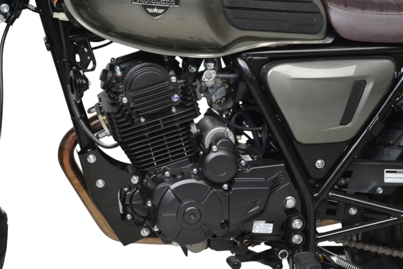 Мотоцикл оснащен двигателем 175FMN (баланс. вал), с 6 ступенчатой КПП, мощностью 25 л.с. Установлен усиленный толстостенный руль.