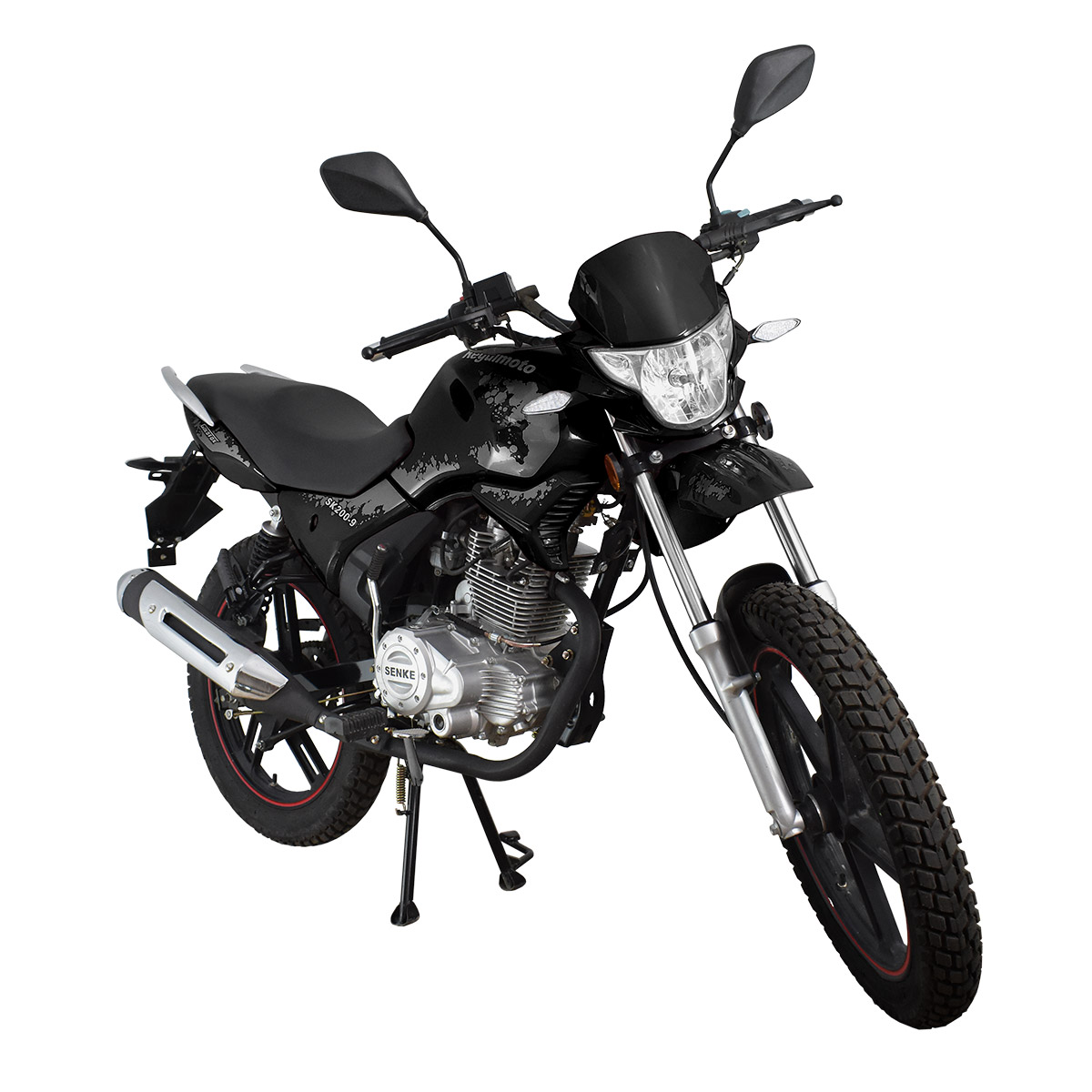 Regulmoto SK200-9 отличают современный внешний вид и обширные возможности практического использования: комплектация байка dual-sport резиной и увеличенный дорожный просвет позволяет эксплуатировать его как на асфальтированных дорогах, так и на проселках и тропах, включая легкое бездорожье.
