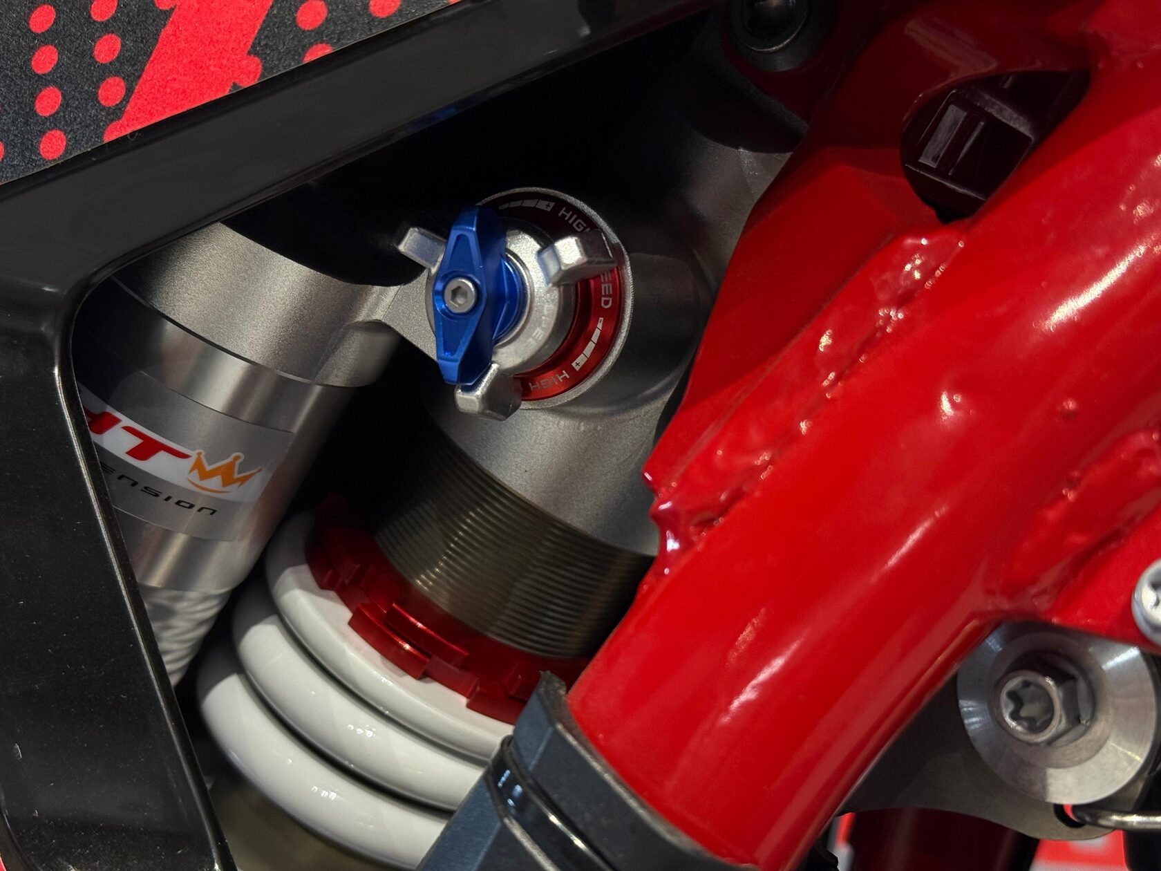 Ходовая часть настроена с прицелом на активную езду. Передняя подвеска HTW T9 SCC длиной 930 мм с картриджной системой и задний амортизатор HTW T10 без линка создают оптимальный баланс между мягкостью и упругостью. Мотоцикл уверенно отрабатывает неровности, сохраняет стабильность на разбитых участках и позволяет агрессивно проходить повороты. Фрезерованные траверсы AJ1 2024 добавляют точности управлению, а усиленный руль из алюминия AL7075 обеспечивает жёсткость и устойчивость к нагрузкам при прыжках и падениях.