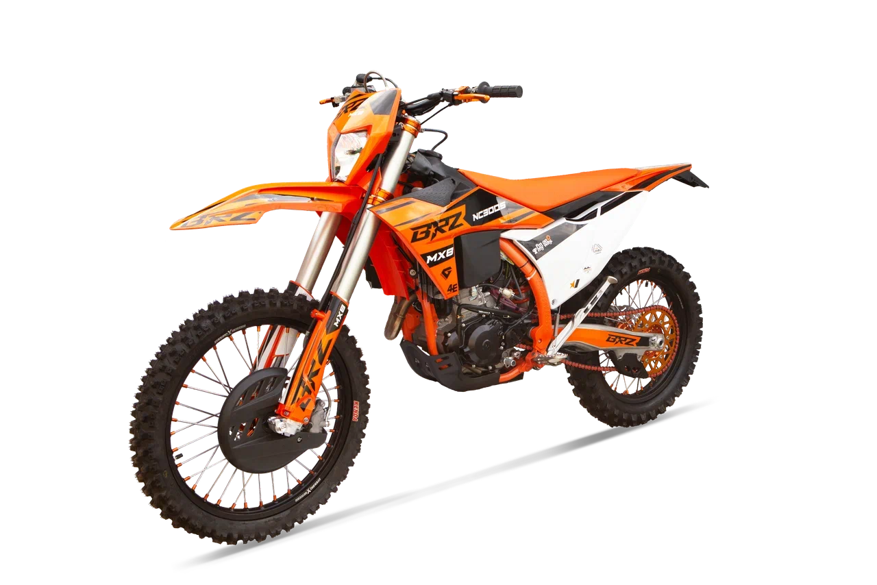 Полноразмерный мотоцикл BRZ MX8 NC300s 24, топовый в линейке. Колесная база 1490 мм. Мотор жидкостного охлаждения, 2 распредвала. КПП на 6 передач. Пластик KTM 24.