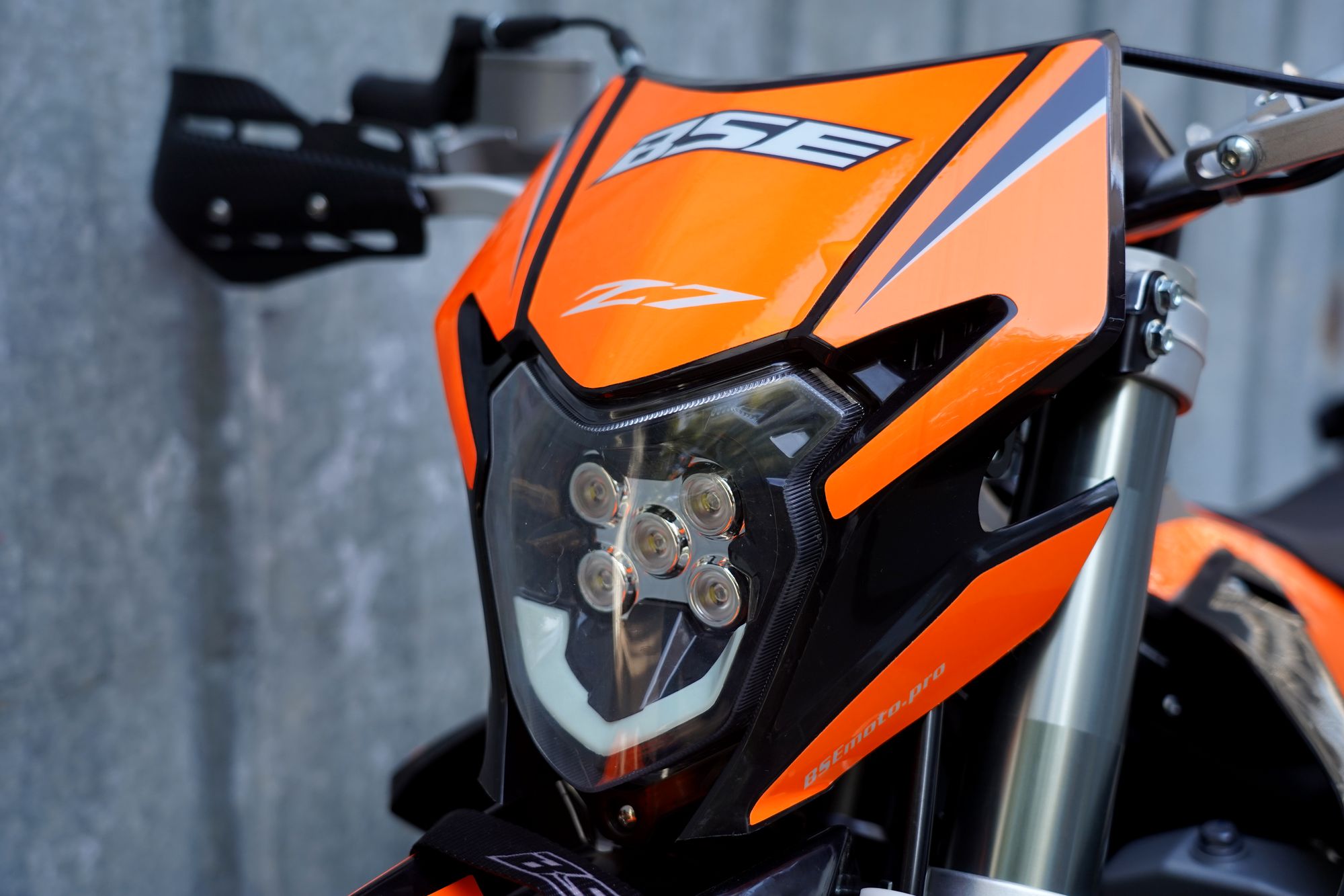 На мотоцикле установлены: прочнейший алюминиевый подрамник, усиленные легкосплавные колёсные диски, усиленная цепь, защита рук, датчик моточасов, прочные анодированные CNC ступицы, защита помпы и коллектора. Мощная гидравлическая тормозная система HSК Racing остановит байк в любых условиях. На BSE Z7 также можно с комфортном отправиться в продолжительное путешествие благодаря удобному сиденью, широкому спортивному рулю и наличию электростартера. Благодаря яркой LED фара головного света можно кататься в ночное время.