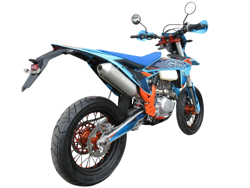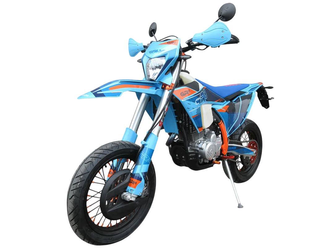 Мотоцикл-мотард GR8 F300A (4T CB300RL) Motard 2024 модельного года является городской версией модели GR8 F300A, адаптированной под езду по асфальту, имеющей шоссейную резину, полный набор светотехники и ПТС. Этот мотоцикл представляет собой оптимальный баланс производительности и технической оснащённости и создан для тех, кто не хочет расставаться с эндуро даже в городе. Идеальный снаряд как для гонок в классе супермото или стант-райдинга, так и для повседневной городской езды.