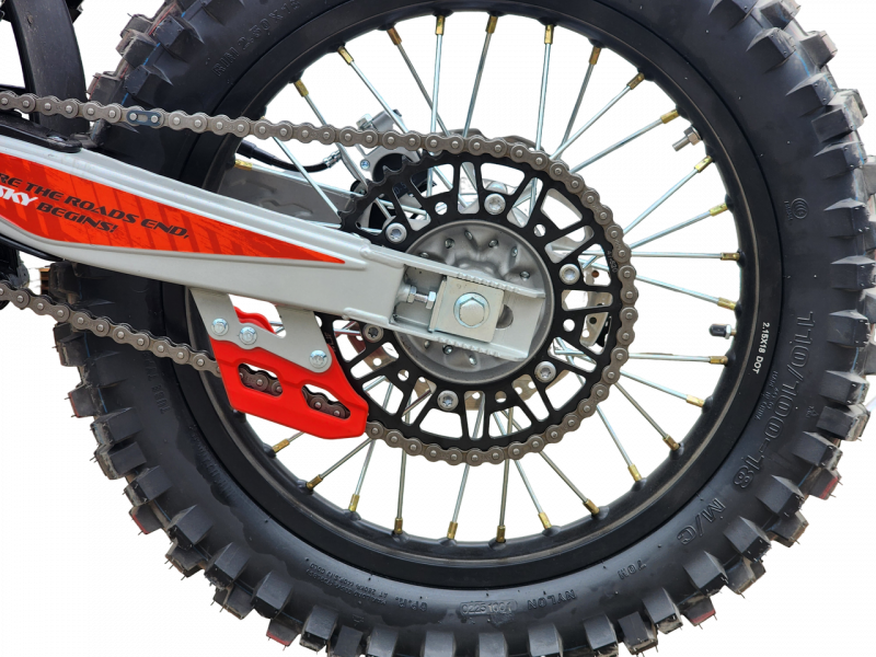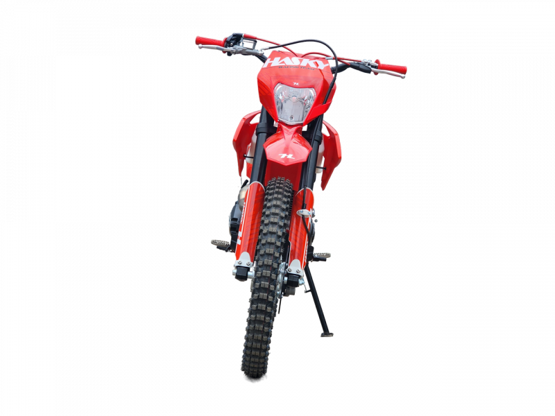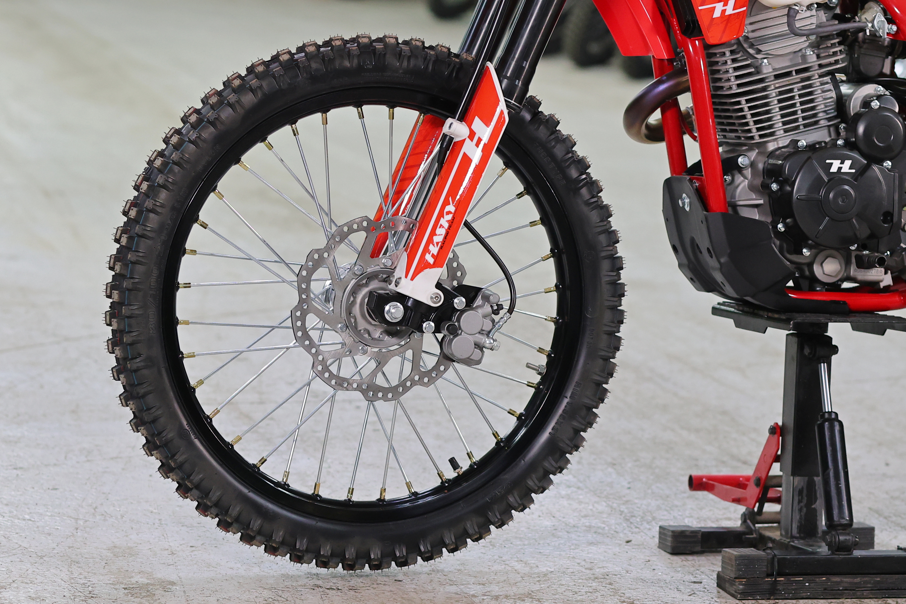 Мотоцикл комплектуется передним колесом 21" с покрышкой 80/100-21 и задним 18" с покрышкой 110/100-18, оснащенными фиксаторами. Эргономика управления улучшена за счет новых пультов в стиле KTM, ручки газа Nibbi и грипсы lock-on. Защита двигателя, рамы и перьев повышает долговечность. Дополнительные удобства включают подножки для пассажира, пеги увеличенной ширины от AJ1, мощную светодиодную фару и счетчик моточасов.