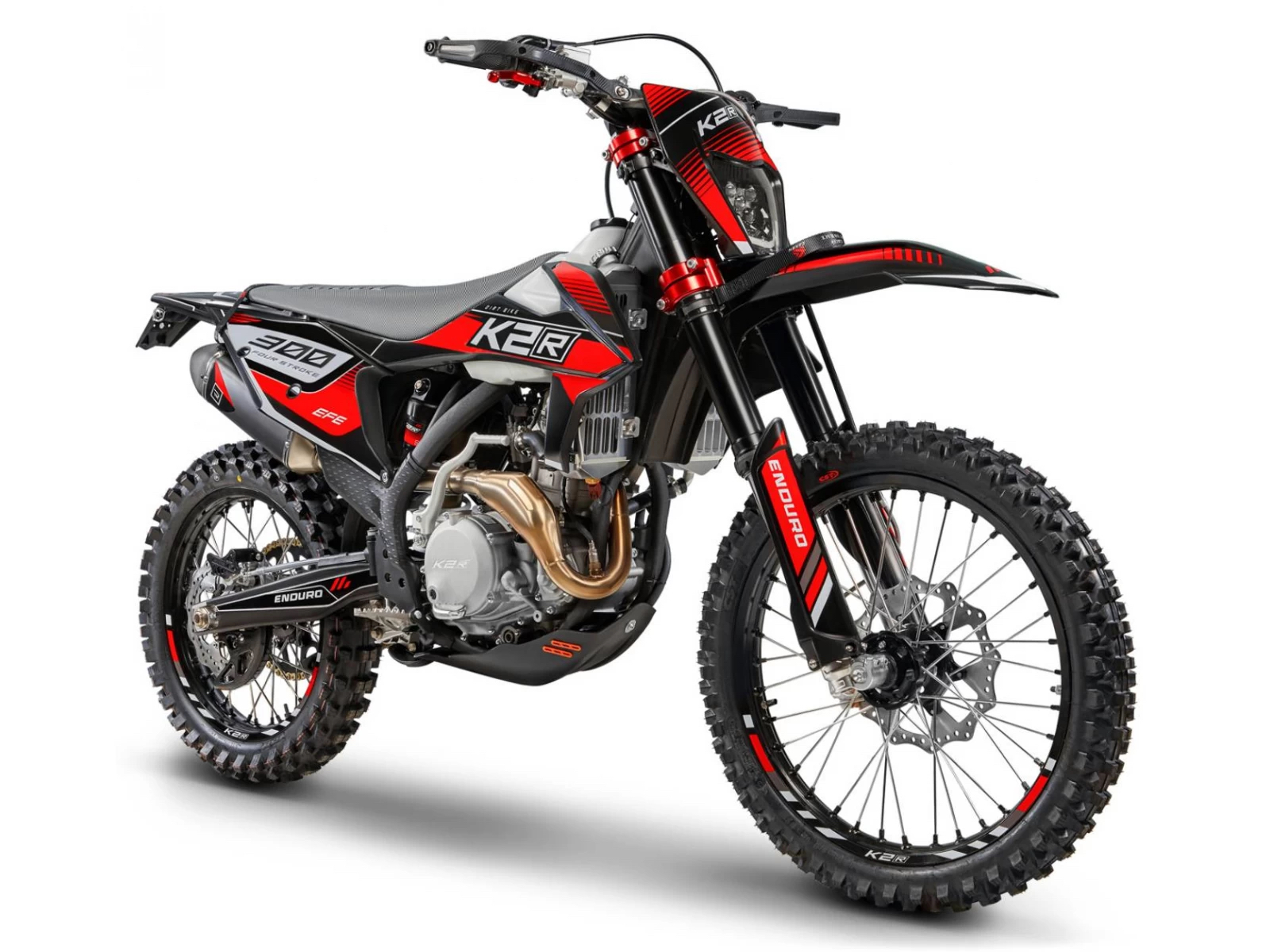 В базовое оснащение модели K2R 300 EFE входит все необходимое для полноценной езды: защита рук, защита радиатора и картера двигателя, защита прогрессии задней подвески, неломающиеся ручки тормоза и сцепления, power bomb на выпуске, датчик моточасов и светодиодная фара головного освещения.
