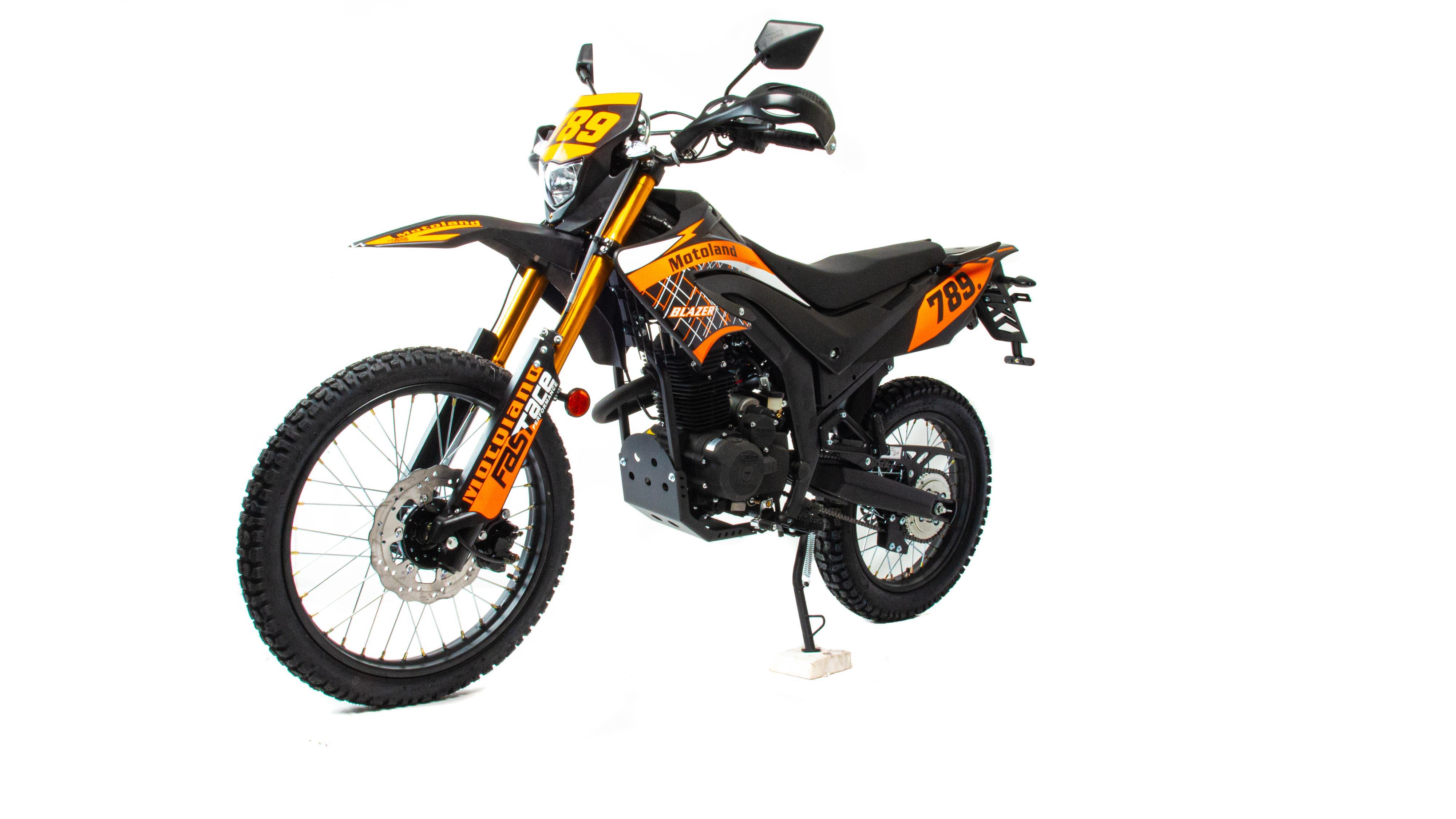 Motoland BLAZER 250 - отличный эндуро-мотоцикл по доступной цене. Двигатель 165FMM мощностью 16 л. с., усиленную «перевернутую» переднюю вилку, защиту двигателя и рук, LCD-панель, светодиодные поворотники и стоп-сигнал и кроссовую фару.