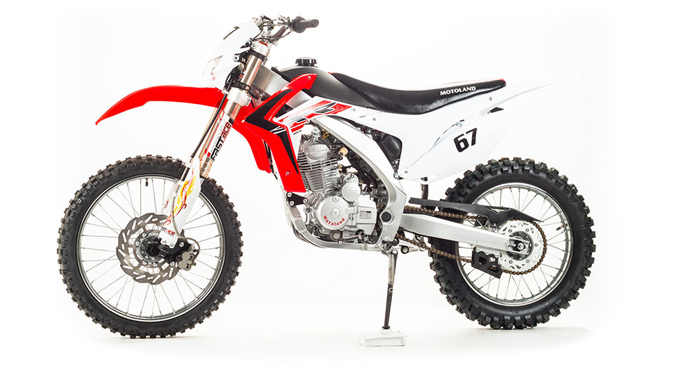 Подвеска у данной модели имеет стандартную прогрессию, как у большинства «китайцев». Размеры сальников прогрессии – 32х17х4, размеры подшипников – NK 17/16. Если Вам крайне важна качественная подвеска у мотоцикла, вместо предыдущей модели стоит купить Motoland 250 XR Fast Ace. Единственное отличие между ними заключается именно в этой детали, однако оно вносит немало нового в поведение транспорта, переводя его из чисто любительского класса уже в более профессиональный. Подвеска Fast Ace гораздо мягче стандартной, поэтому она во много раз лучше преодолевает неровности. Наличие регулировок позволяет подстроить амортизаторы под индивидуальные предпочтения. Размеры передних амортизаторов Fast Ace составляет d48x51, заднего амортизатора на данной модели составляют 470 мм. Задний маятник мотоцикла тоже стандартный, металлический.