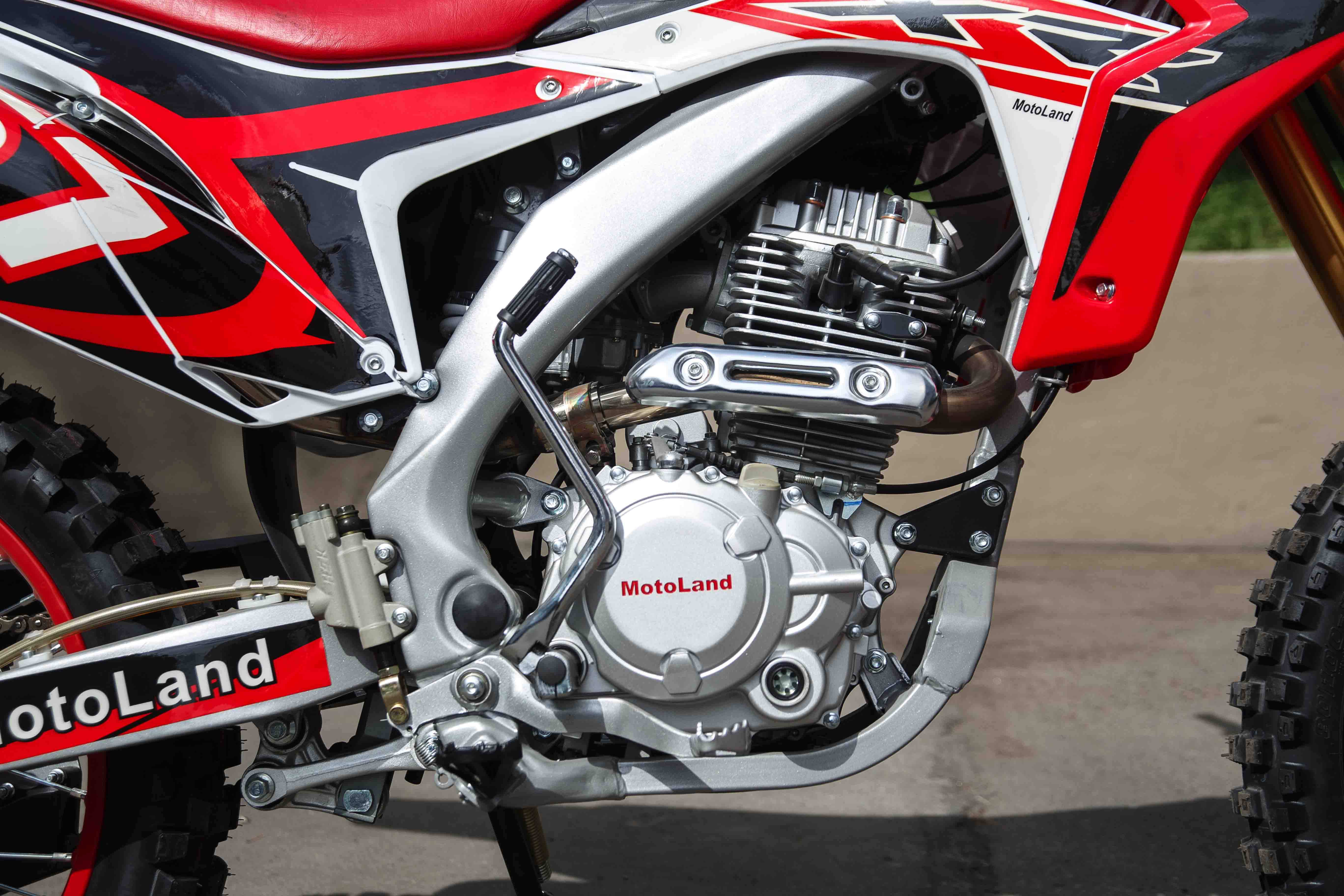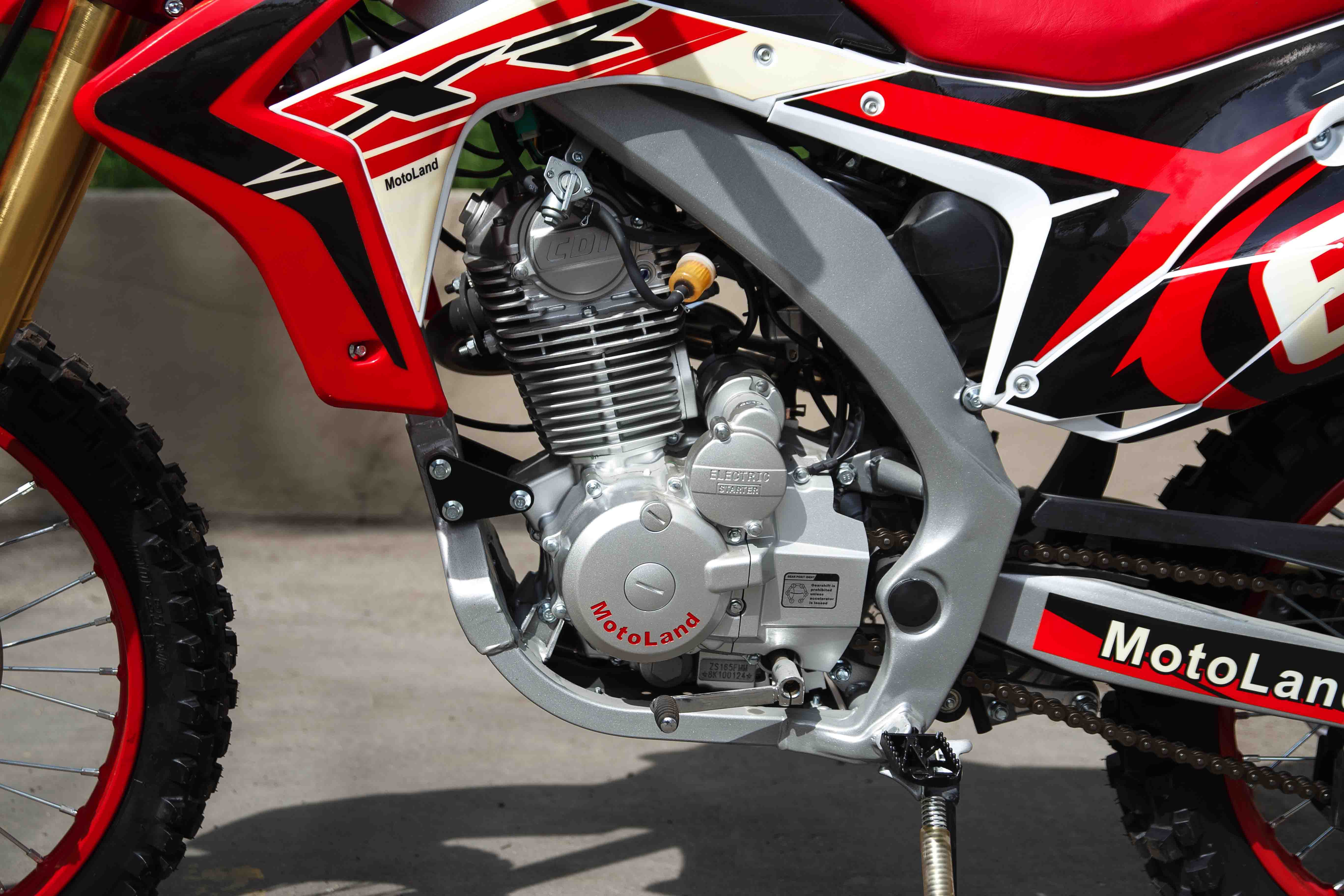 На мотоцикле установлен обычный для китайских кроссовых мотоциклов двигатель 169 FMM с 17 л.с. мощности, с воздушным охлаждением и рабочим объемом 230 кубов . Диаметр поршня движка составляет 65,5 мм, балансирный вал в конструкции не предусмотрен. Коленвал у мотоцикла Motoland XR 250 имеет палец диаметром 15 мм. Новые партии оснащаются карбюраторами PZ 30 с ускорительным насосом. Для удобства запуска мотора предусмотрен электростартер.