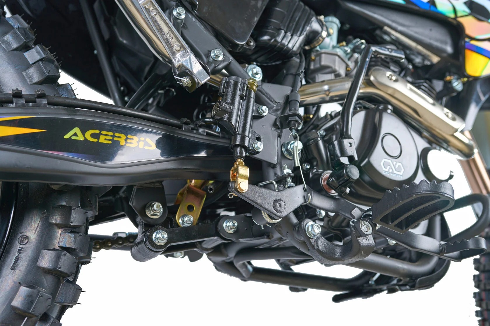 Размер передней покрышки: 80/100-21. Размер задней покрышки: 120/100-18. Они прекрасно себя ведут по песку и грязи, что позволяет райдеру отлично показать себя на пересеченной местности