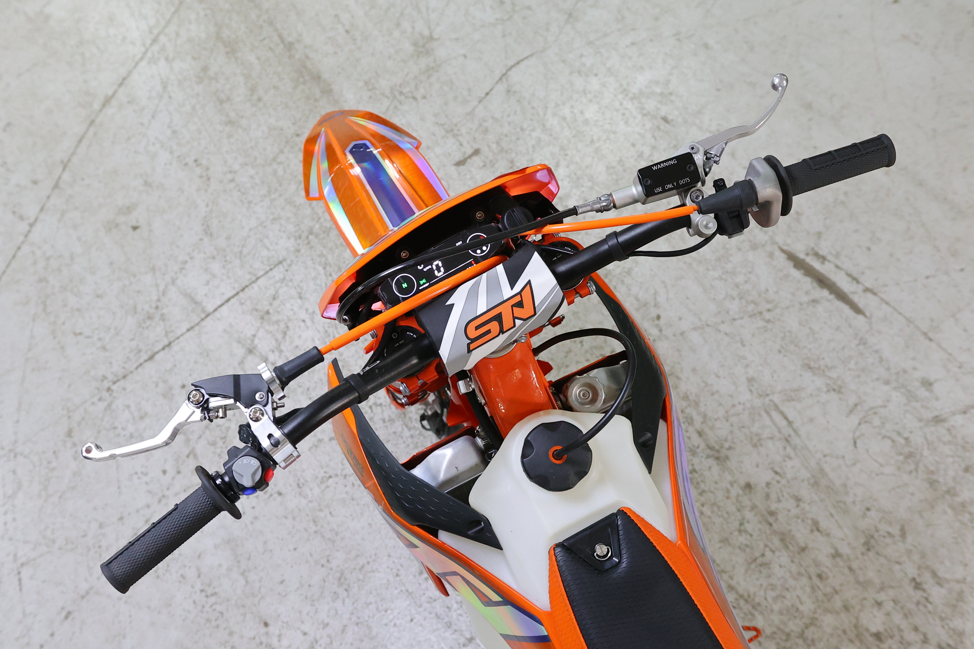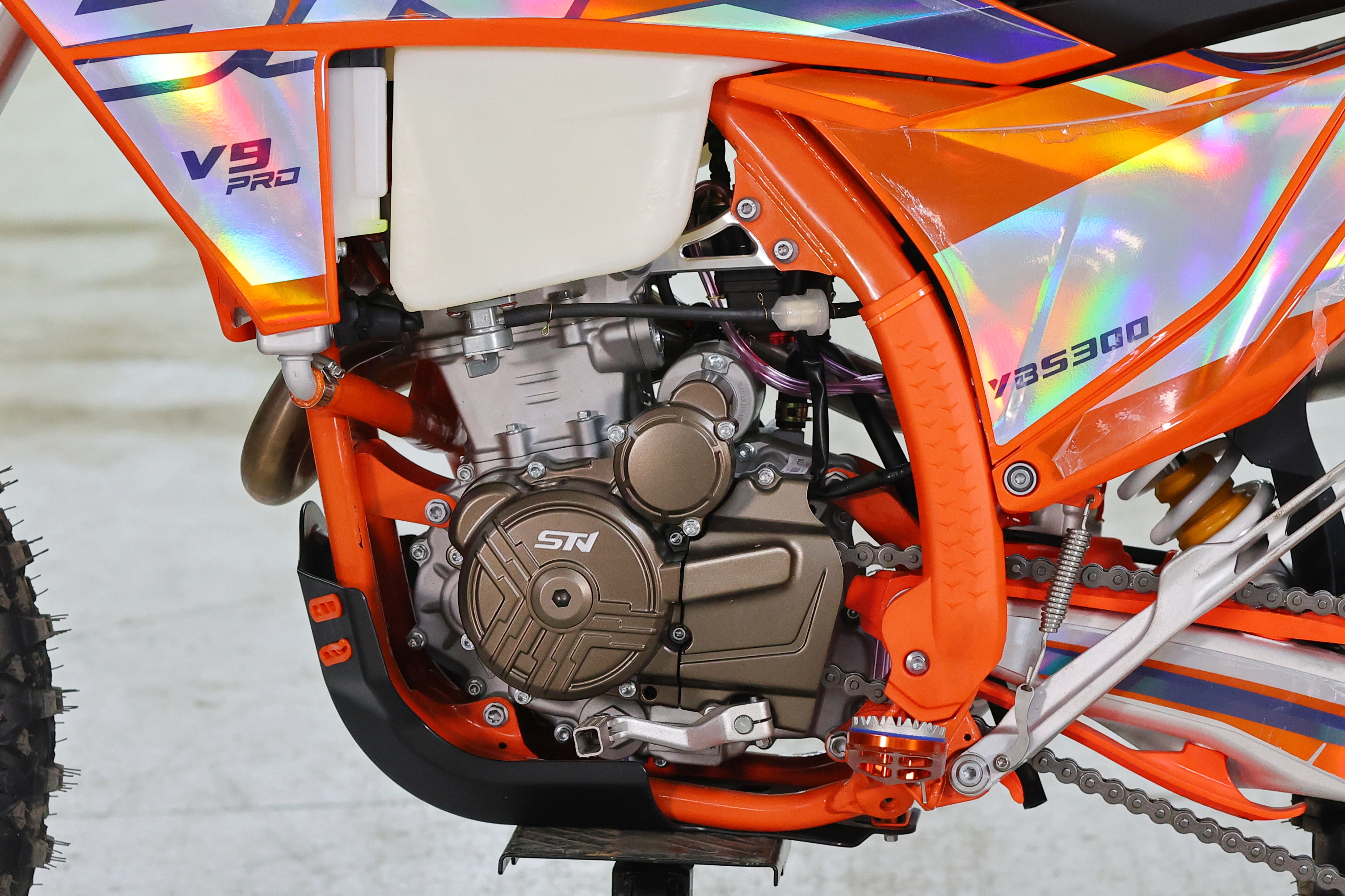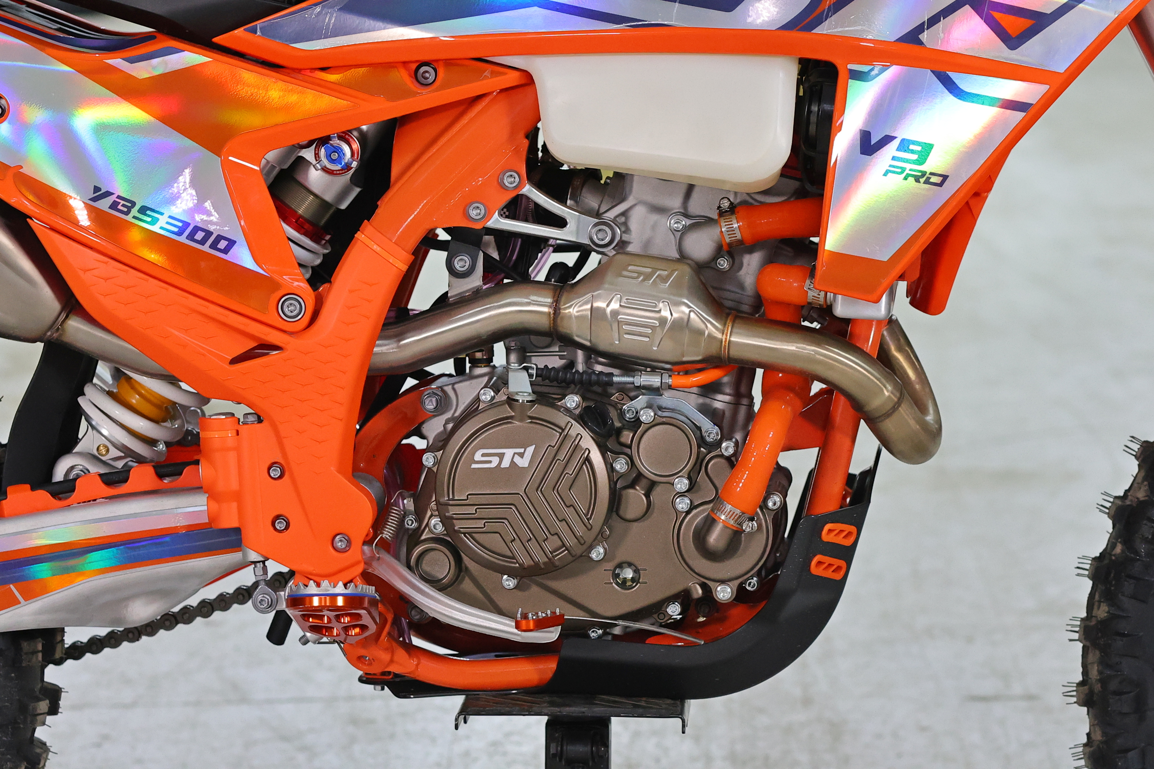 Топовый эндуро мотоцикл STN V9 YBS300 PRO - главная новинка этого сезона. Это полноразмерный эндуро жидкостного охлаждения на новейшем моторе Loncin YBS300 PRO. Главная особенность нового мотора в доработанной системе охлаждения и усиленном сцеплении.Работает мотор в паре с карбюратором NIBBI PWK34. В итоге мощность 30 л/с, что в купе с мощной тягой даёт массу впечатлений на треке.
