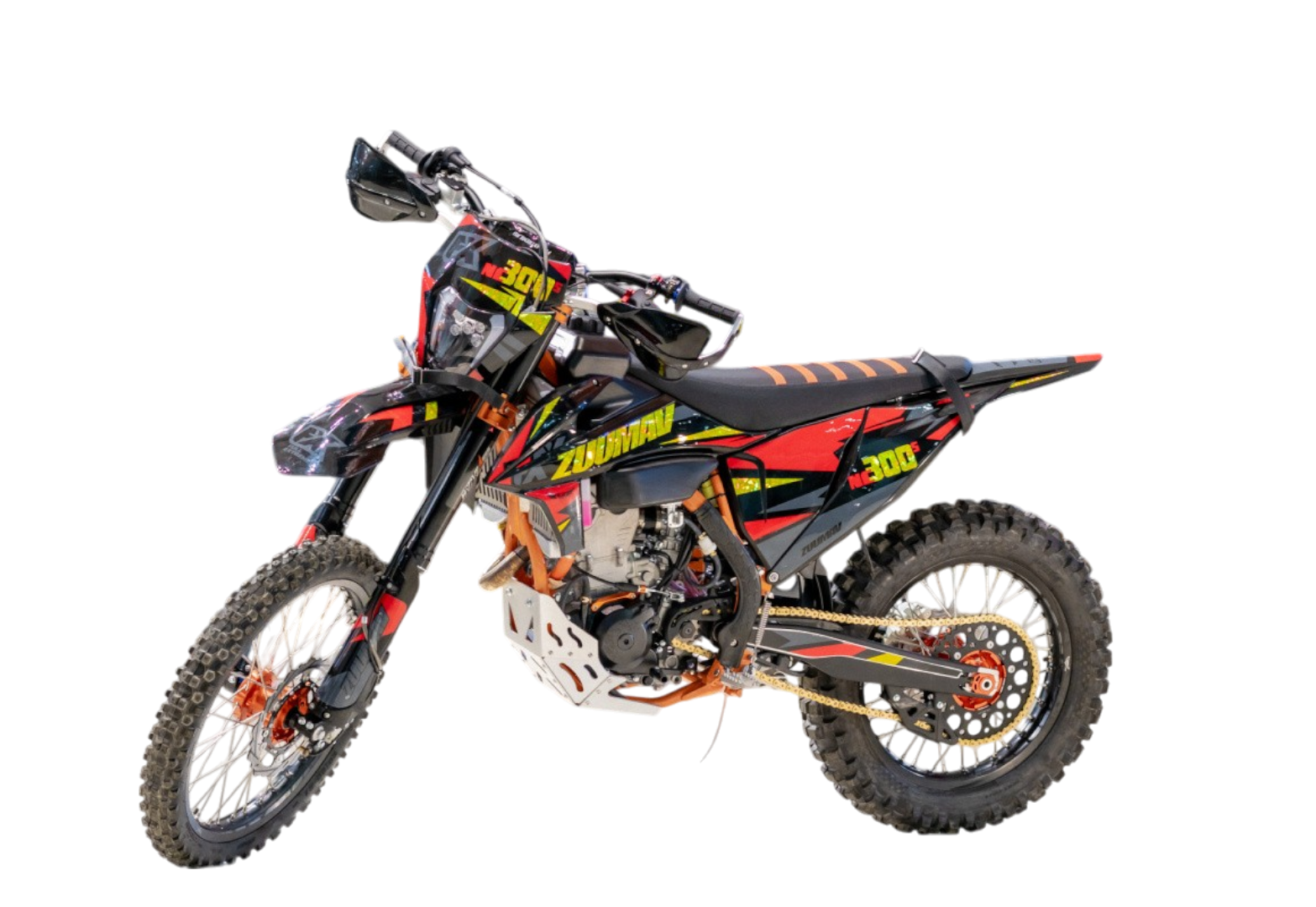 Модель ZUUMAV К8 NС300. Хром-Молибденовая рама повышенной прочности,Алюминиевый маятник,Двигатель Zongshen 4Т,177MМ-5, заявленная мощность 36 л.с. Коробка 6-МКПП,водяное охлаждение с вентилятором (PANASONIC), защита радиаторов, легкий выжим сцепления AJ1®,электро и кикстартер, Трехпозиционный ключ зажигания,Цифровой дисплей + счетчик моточасов,Алюминиевый руль 28/22 сплав 7075, Короткоходная ручка газа СNC,Армированная защита рук,Складные рычаги тормоза и сцепления IGP CNC ,Обода Алюминий 7116 , Ступицы анодированные CNC,Спицы из нержавеющей стали 4 мм, траверсы CNC, передняя вилка полностью регулируемая KKE 54*60- 940мм шток 48мм, задний амортизатор полностью регулируемый ККЕ с Алминиевой прогрессией, антискользящие сиденье. Белый увеличенный топливный бак емкостью 10 литров. Карбюратор NIBBI RACING PWK34 Black. Звезды перед/зад 13/52. Цепь SFR 520. Шины перед/зад 80х100-21, 110х100-18 KENDA off-road. Выхлопная система с резонатором из нержавеющей стали. Глушитель копия FMF. Буксаторы AJ1® облегченные композитные. Диодная фара с ходовыми огнями, щиток номера. Комплект жиклеров карбюратора, алюминиевая защита двигателя. Защита рамы, подшипники Тайвань.