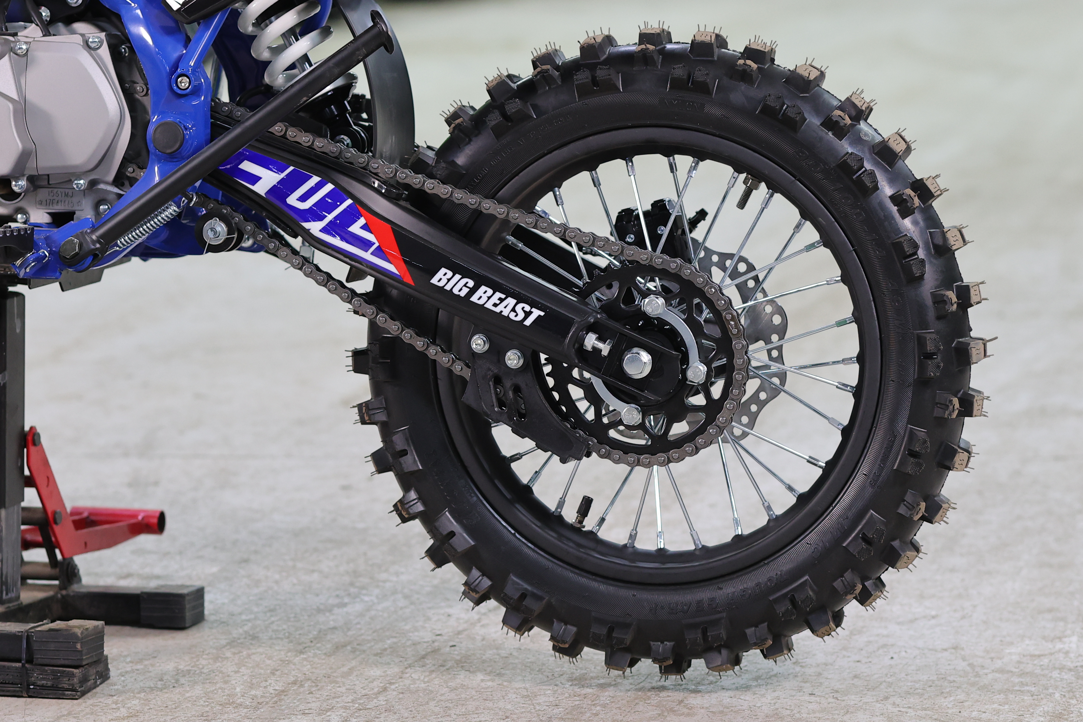 Колеса размером 17/14 дюймов с качественными покрышками обеспечивают отличное сцепление с грунтом, а установленные спереди и сзади дисковые гидравлические тормоза гарантируют уверенное и эффективное торможение в любой ситуации. Передача мощности на заднее колесо осуществляется через цепную передачу, что делает ускорение предсказуемым и полностью контролируемым.