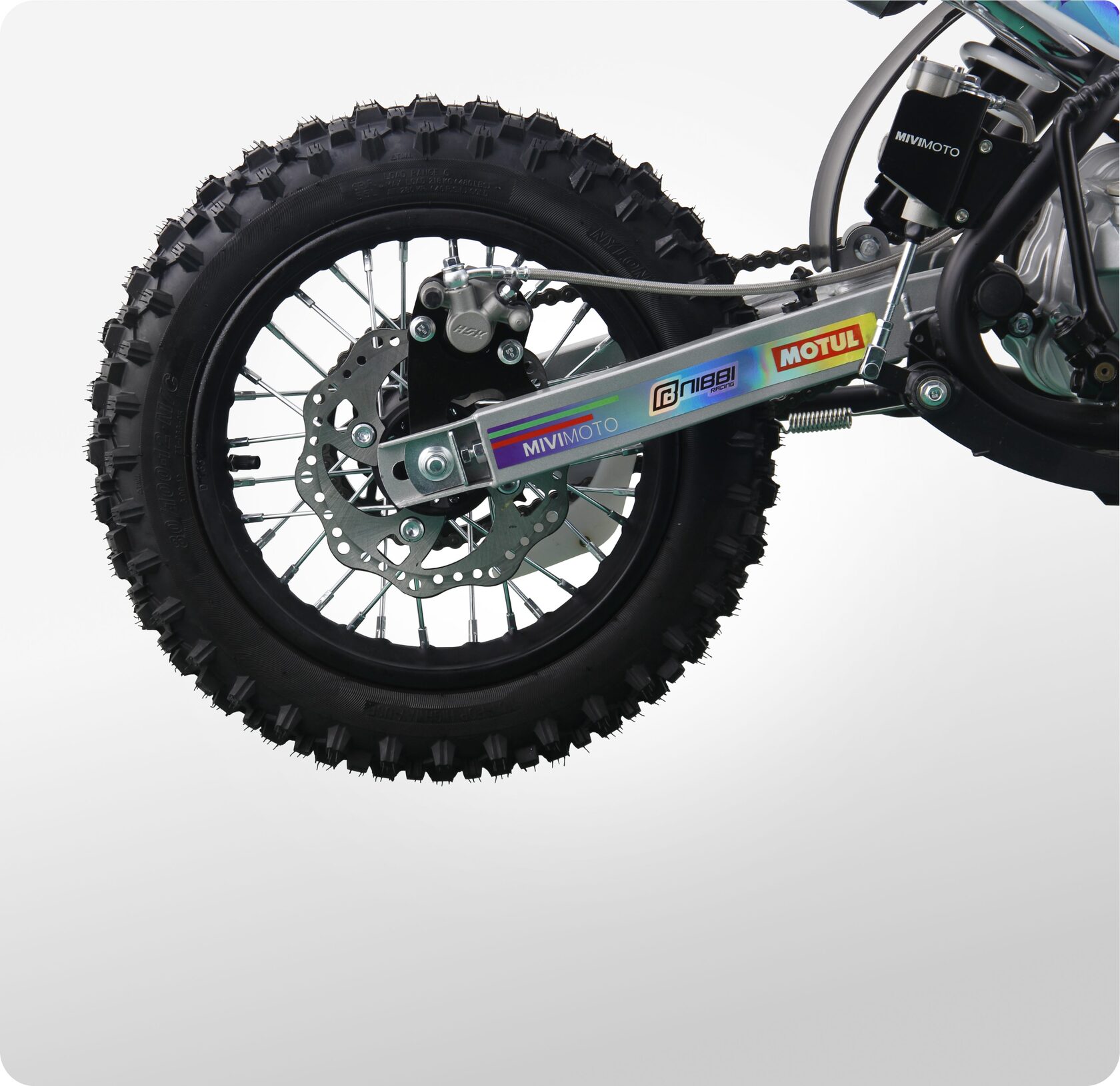 - Спереди питбайк оснащен перевернутой телескопической вилкой KYB tech, сзади — моноамортизатором с регулируемой жесткостью. Конфигурация обеспечивает плавный ход, хорошую отработку неровностей и комфорт при прыжках и резких маневрах.