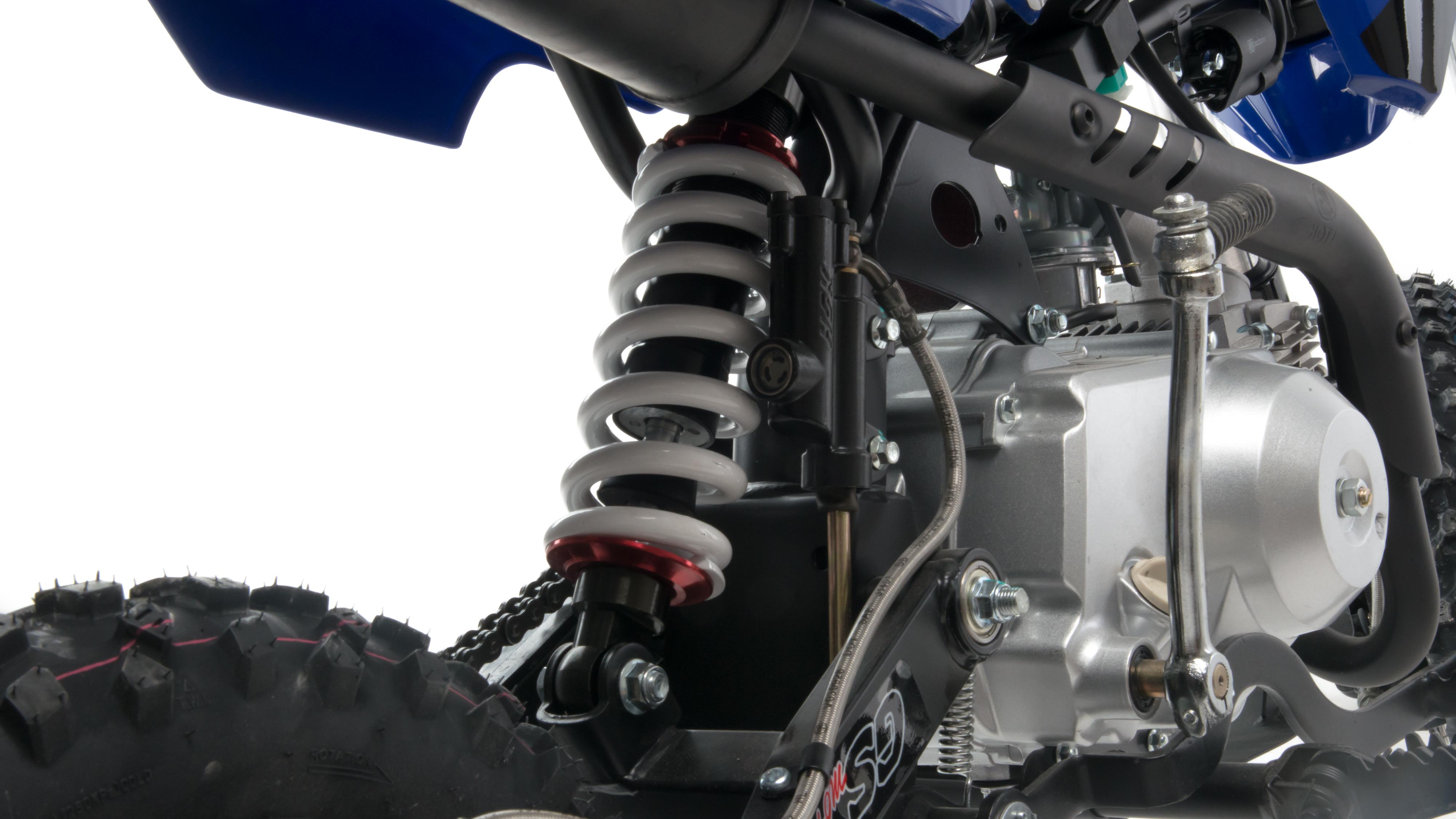 Покрышки с шипами и высоким грунтозацепом идеальны для бездорожья. Мощность мотора и небольшой вес питбайка позволяют ему преодолевать значительные препятствия и хорошо заходить в подъёмы.