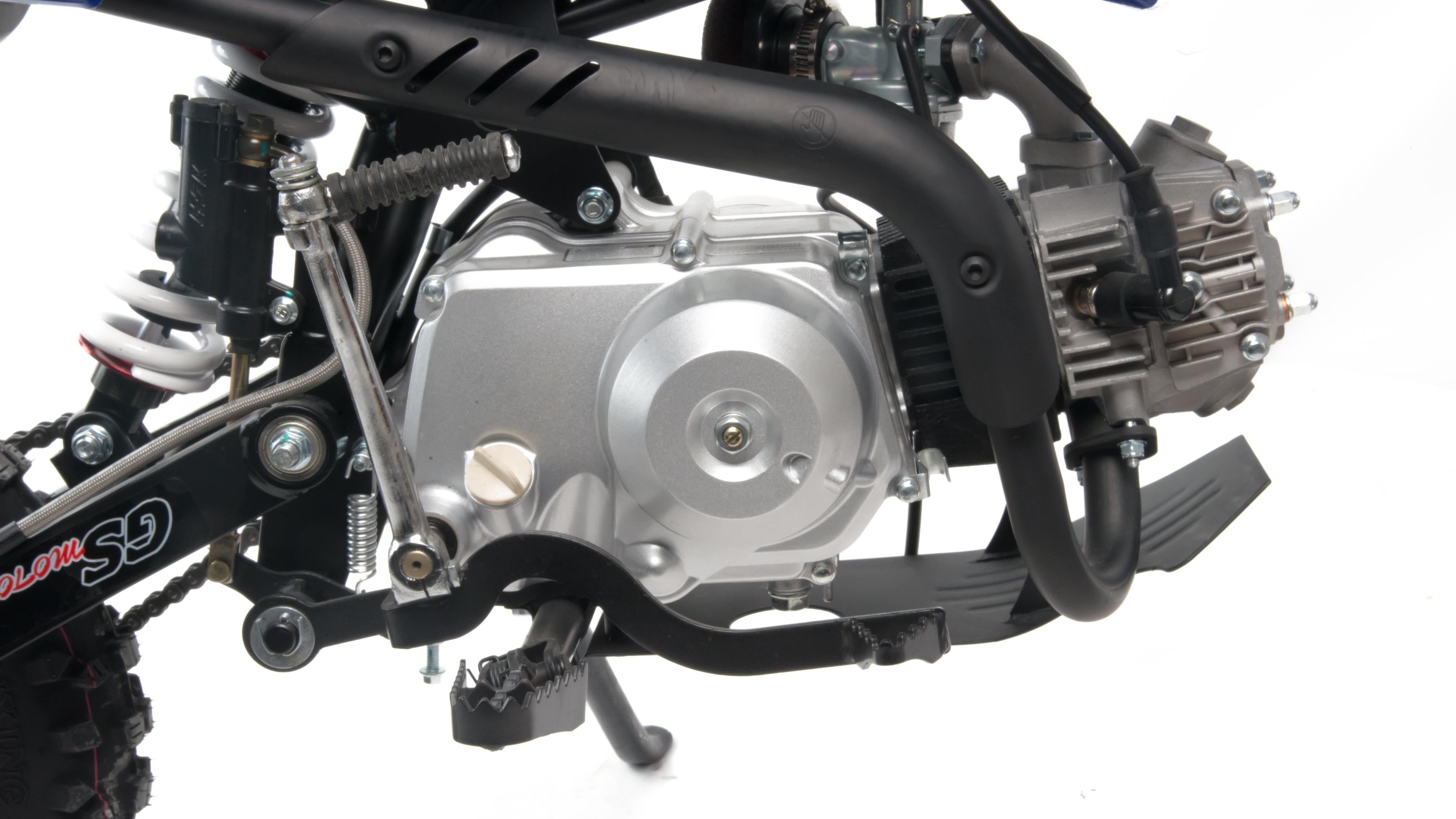 Питбайк оснащён карбюратором JINGKE и одноцилиндровым четырёхтактным двигателем с воздушным охлаждением. Надёжный мотор мощностью 8 л. с. и объемом 110 см³ разгоняет питбайк до 70 км/ч. Трансмиссия - 4х ступенчатая. Система зажигания электронная (CDI). Запуска двигателя - кикстартер.