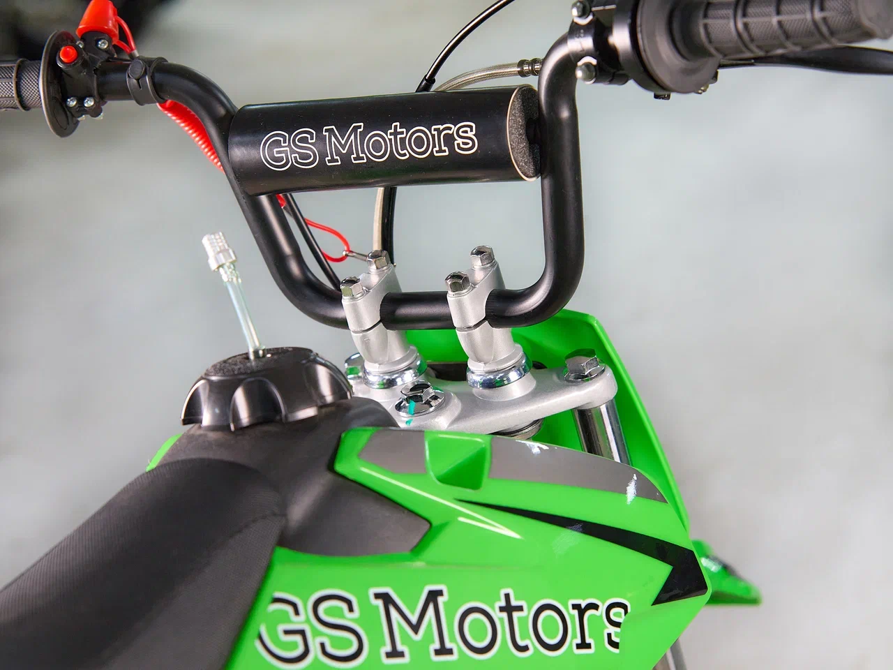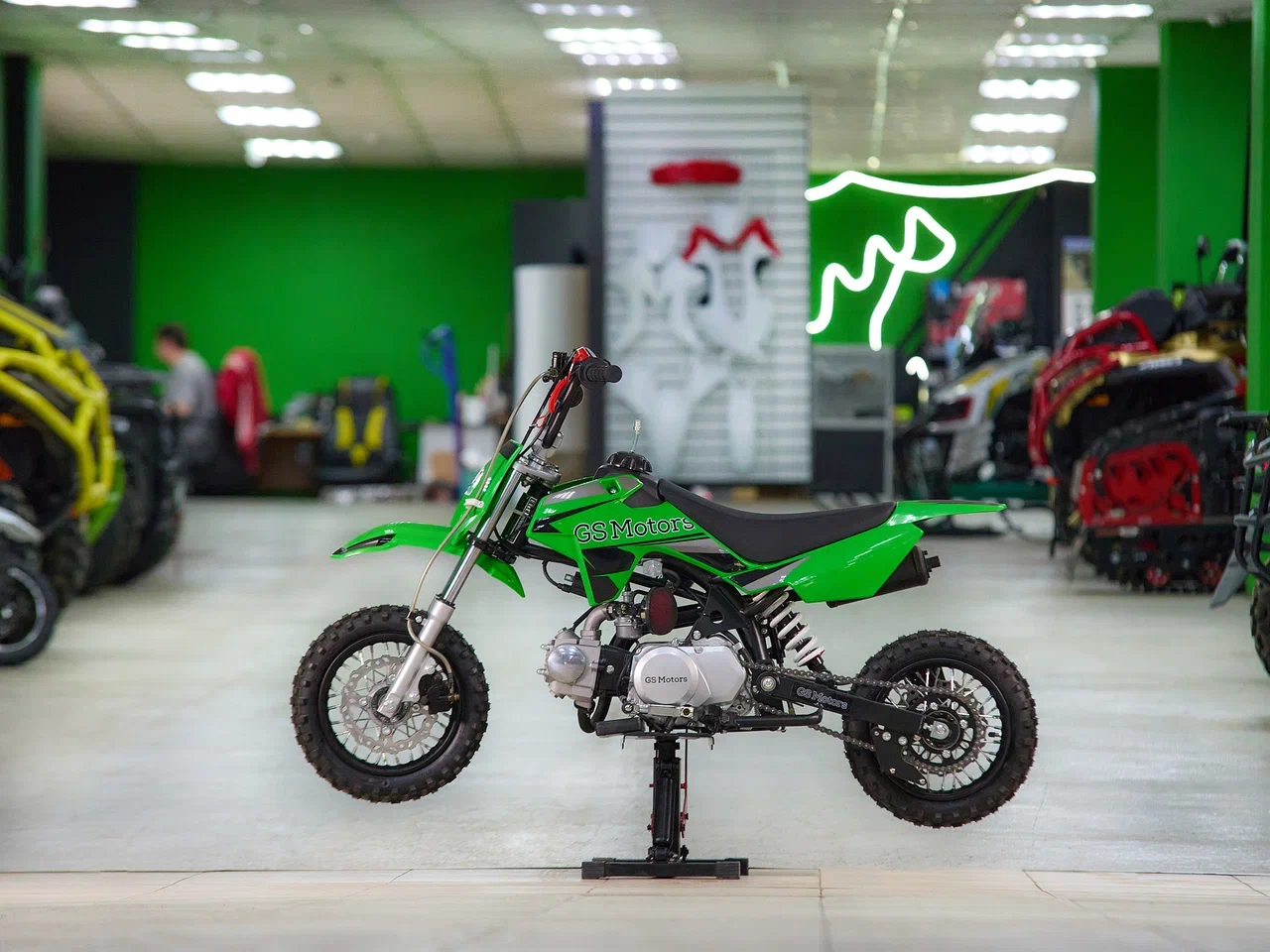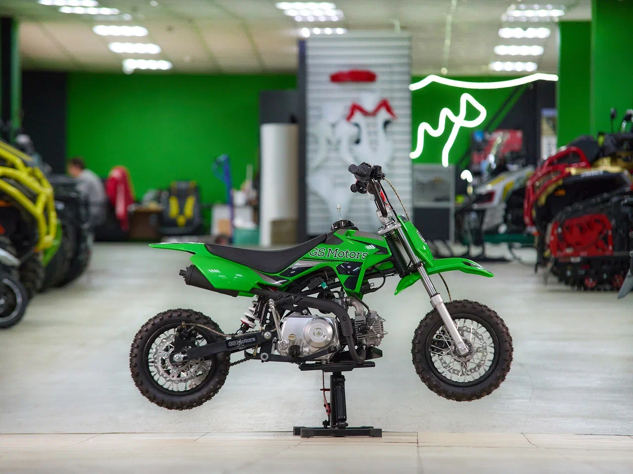 Недорогой надёжный питбайк GS Motors S7 идеален для поездок по грунтовым дорогам и бездорожью для детей которые уже научились ездить на маленьких мотоциклах объемом 50 куб.см. Хорошо чувствует себя на мягком и среднем грунте, разгоняется до 50 км/ч.