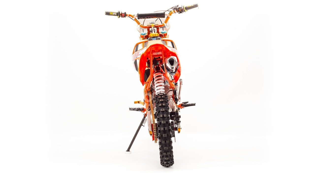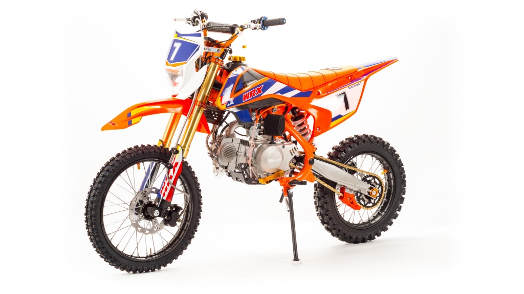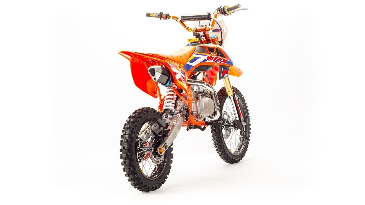 Недорогой надёжный питбайк WRX125 идеален для поездок по грунтовым дорогам и бездорожью. Хорошо чувствует себя на мягком и среднем грунте, разгоняется до 90 км/ч. Оснащён CNC траверсами, фарой, алюминиевыми ободами, весит всего 70 кг. Питбайк прост в управлении и не требует специального ухода, подойдёт как новичкам, так и любителям мотокросса.
