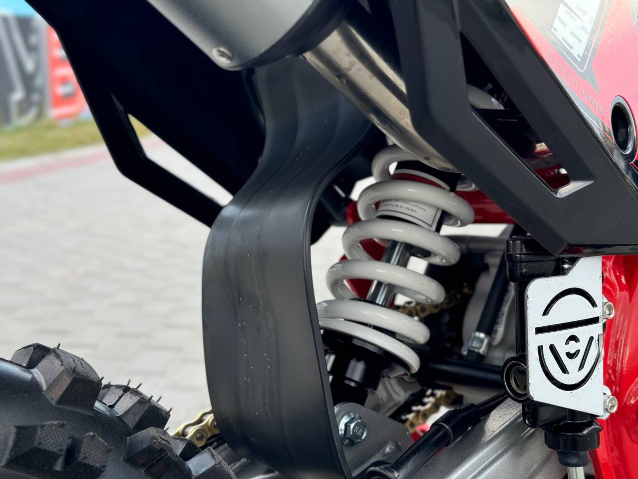 Задняя подвеска (диаметр штока 12 мм) с регулировкой преднатяга пружины помогает питбайку не вилять на поворотах и стабильно проходить все сложные участки трассы. Стальной маятник изготовлен из надёжного хромомолибденового сплава.