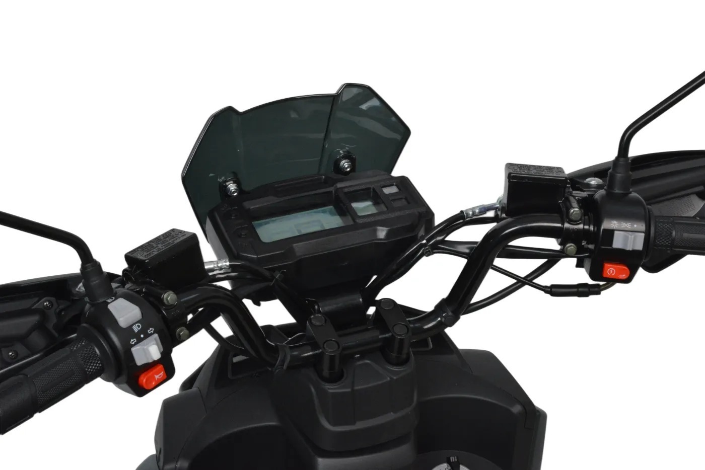 Выдерживает нагрузку до 150 кг, что позволяет перевозить одного пассажира. Под сиденьем есть большое багажное отделение + площадка для крепления дополнительного кофра. Приборная панель — электронная, с очень крупными, легко читаемыми цифрами и часами; со всеми необходимыми указателями.