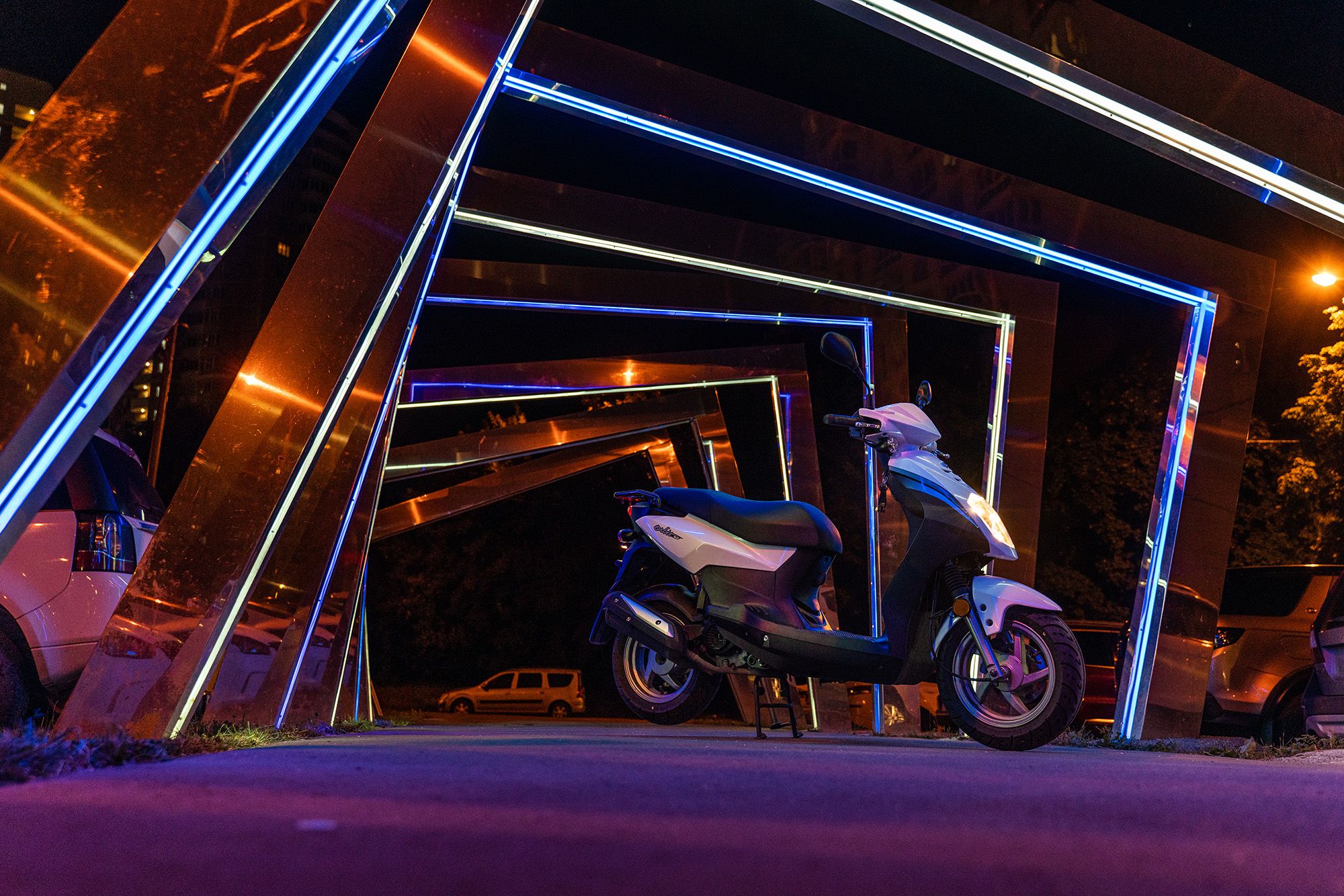 Синий цвет придаёт скутеру современный и аккуратный внешний вид, а фирменная светодиодная оптика обеспечивает отличную видимость днем и ночью. Под сиденьем расположен вместительный багажный отсек для личных вещей или повседневных принадлежностей.