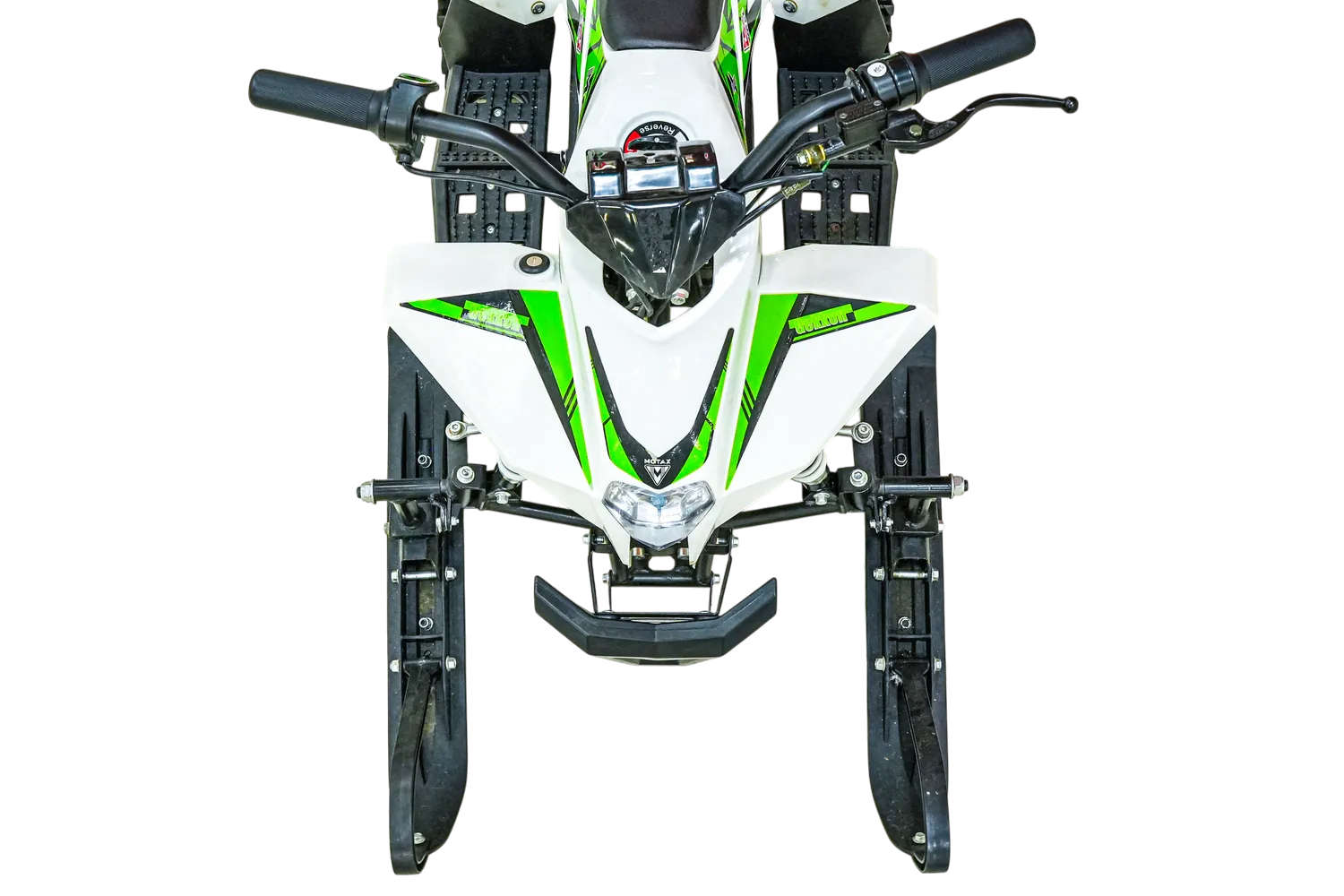 Безопасность и комфорт обеспечиваются задним дисковым тормозом, гидравлическими амортизаторами и прочной стальной рамой. Снегоцикл оснащен стоп-сигналом, звуковым сигналом и чеком аварийной остановки двигателя. Благодаря продуманным размерам и дорожному просвету 130 мм модель подходит детям ростом от 120 до 160 см и выдерживает нагрузку до 65 кг — идеальный выбор для активных зимних прогулок и обучения езде по снегу.
