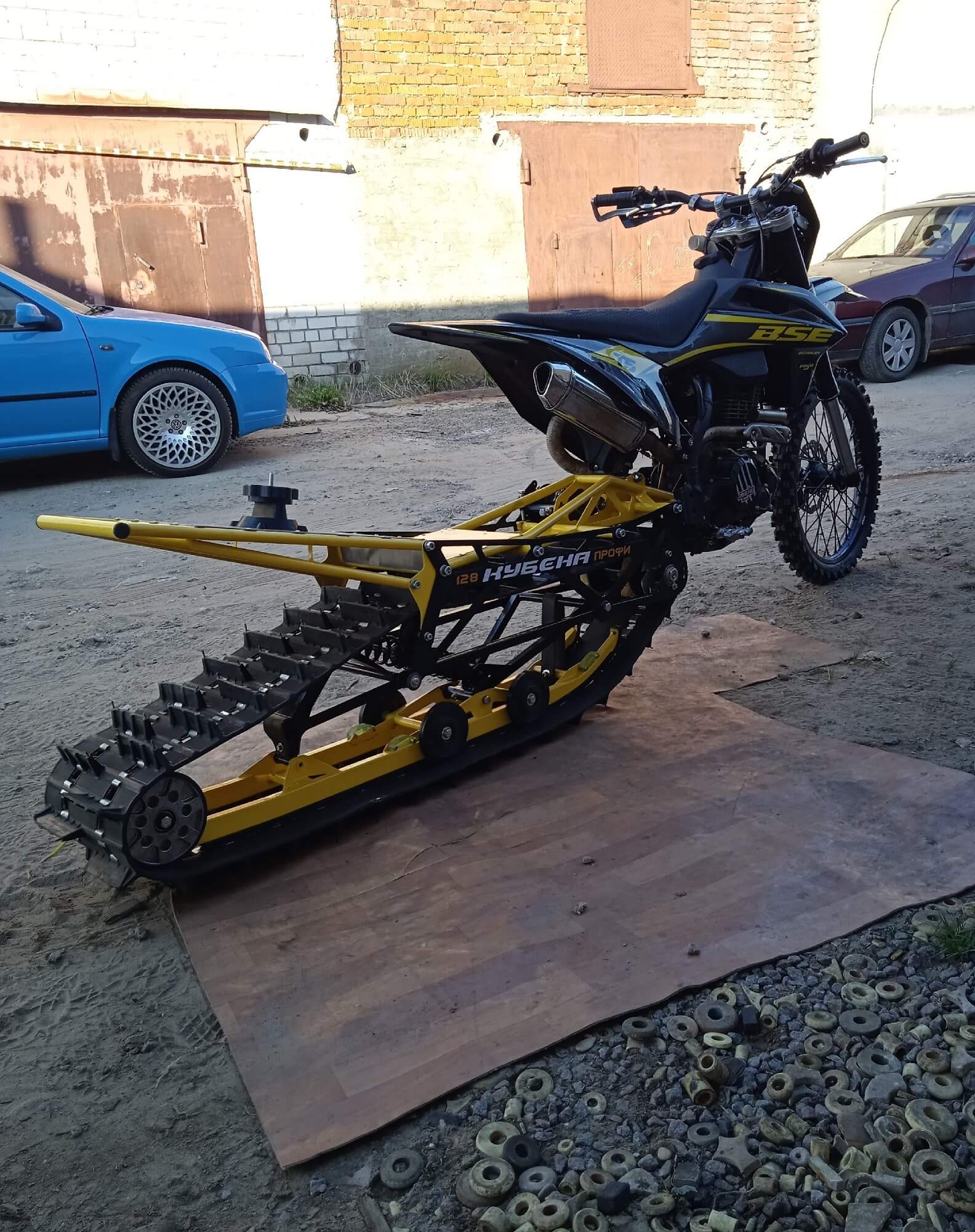 Кубена 128″ ПРОФИ — универсальный гусеничный комплект для внедорожных мотоциклов. Гусеничный мотоцикл (СНОУБАЙК) это, по сути, одноколейный снегоход. Вы получаете возможность продлить мото сезон и эксплуатировать мотоцикл не только летом но и зимой.