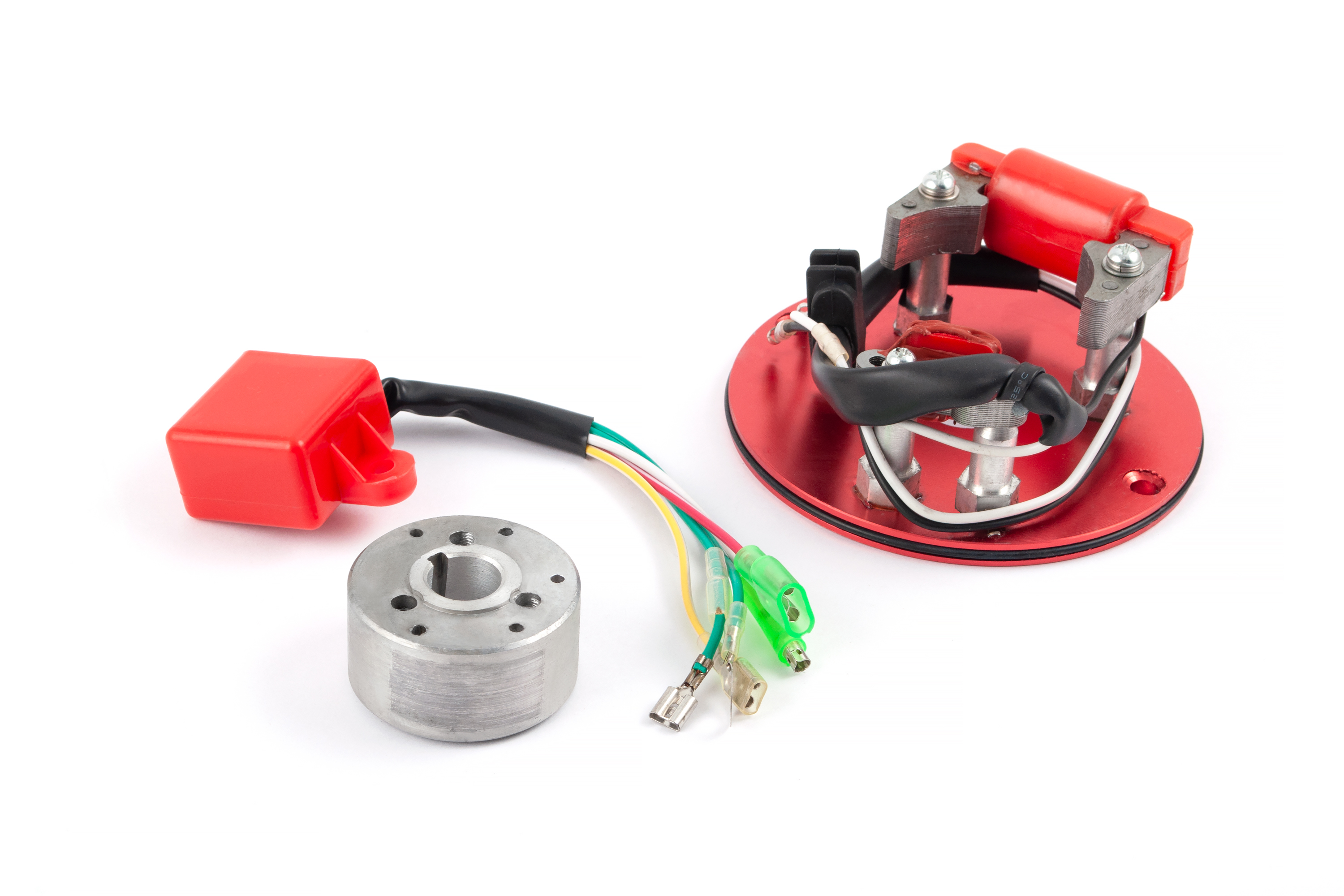 • • Комплектация: Алюминиевая плата (статор) с катушкой, облегченный мини-ротор, гоночный коммутатор (CDI).
