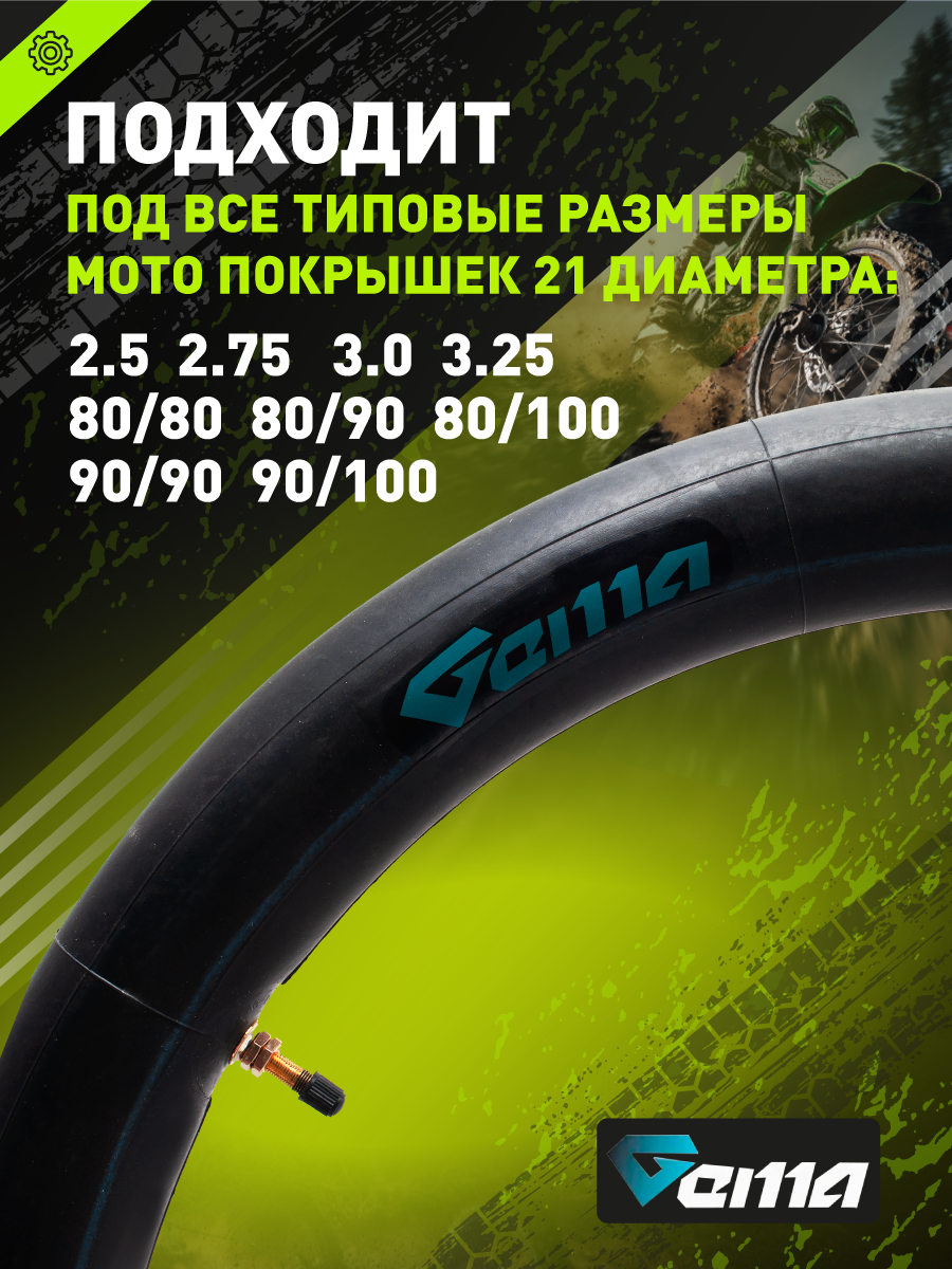 Надёжная передняя камера GEMA разработана для установки на эндуро, кроссовые и дорожные мотоциклы с передним колесом 21 дюйм. Идеально подходит для шин шириной от 2.75" до 3.00" (размер камеры 90/100-21"). Изготовлена из бутила — материала с высокой герметичностью, стойкого к проколам и медленно теряющего давление.