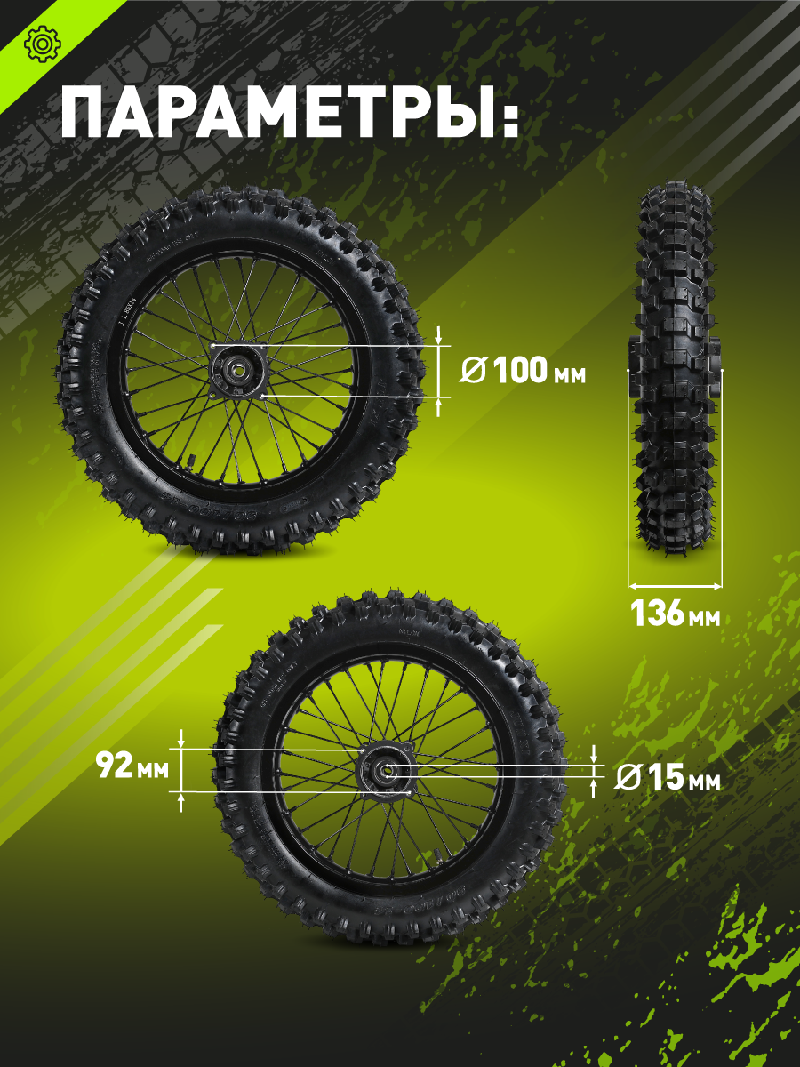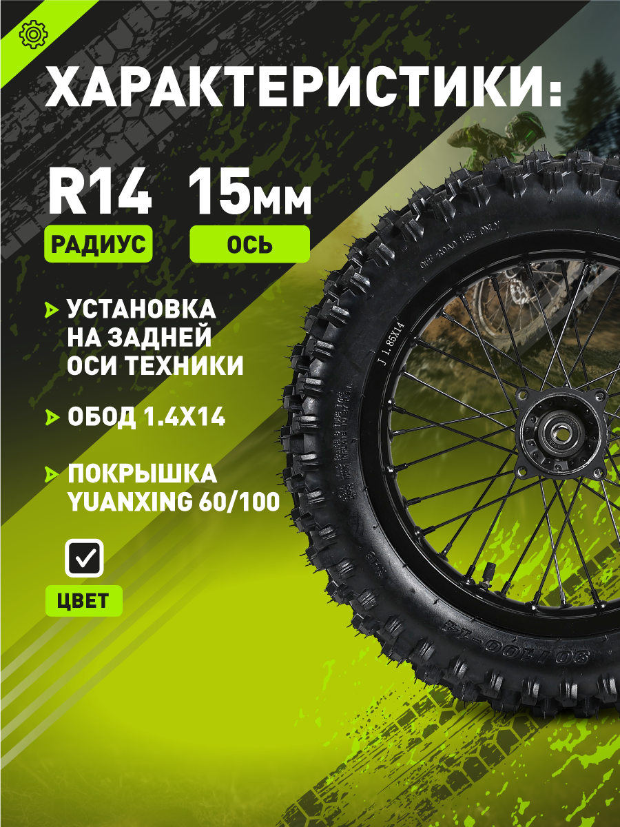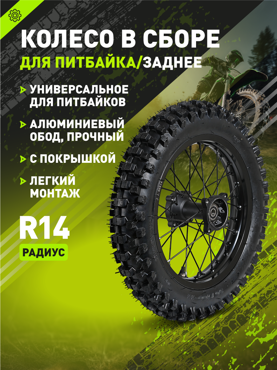- Готовое к установке заднее колесо R14 для большинства питбайков с алюминиевой ступицей под ось 15 мм. В комплекте надёжная покрышка Yuanxing. Колесо поставляется без звезды и тормозного диска, что позволяет использовать уже имеющиеся элементы с вашего мотоцикла или приобрести совместимые компоненты отдельно.