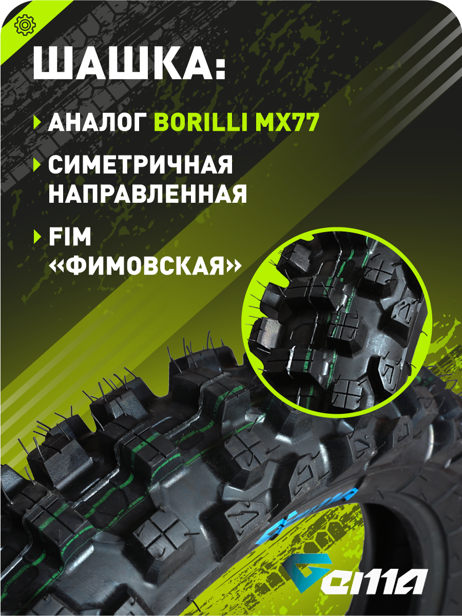 Гоночная супермягкая эндуро/кроссовая покрышка для заднего колеса с корпусом и протектором, адаптированными для сложных, грязевых и мягких покрытий. Является полным аналогом Borilli MX77 — полностью повторяет рисунок шашки, характеристики сцепления и поведение на трассе, сохраняя значительно более доступную цену без компромиссов по качеству.