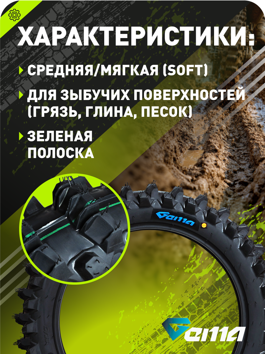 Гоночная кроссовая шина-«лопатка» для заднего колеса, разработанная для экстремального бездорожья (рыхлый песок, глина, грязевые трассы). Это 100% копия знаменитой Pirelli Scorpion MX Soft — повторяет форму, рисунок и структуру протектора оригинала, но имеет значительно более доступную цену без компромиссов по характеристикам.