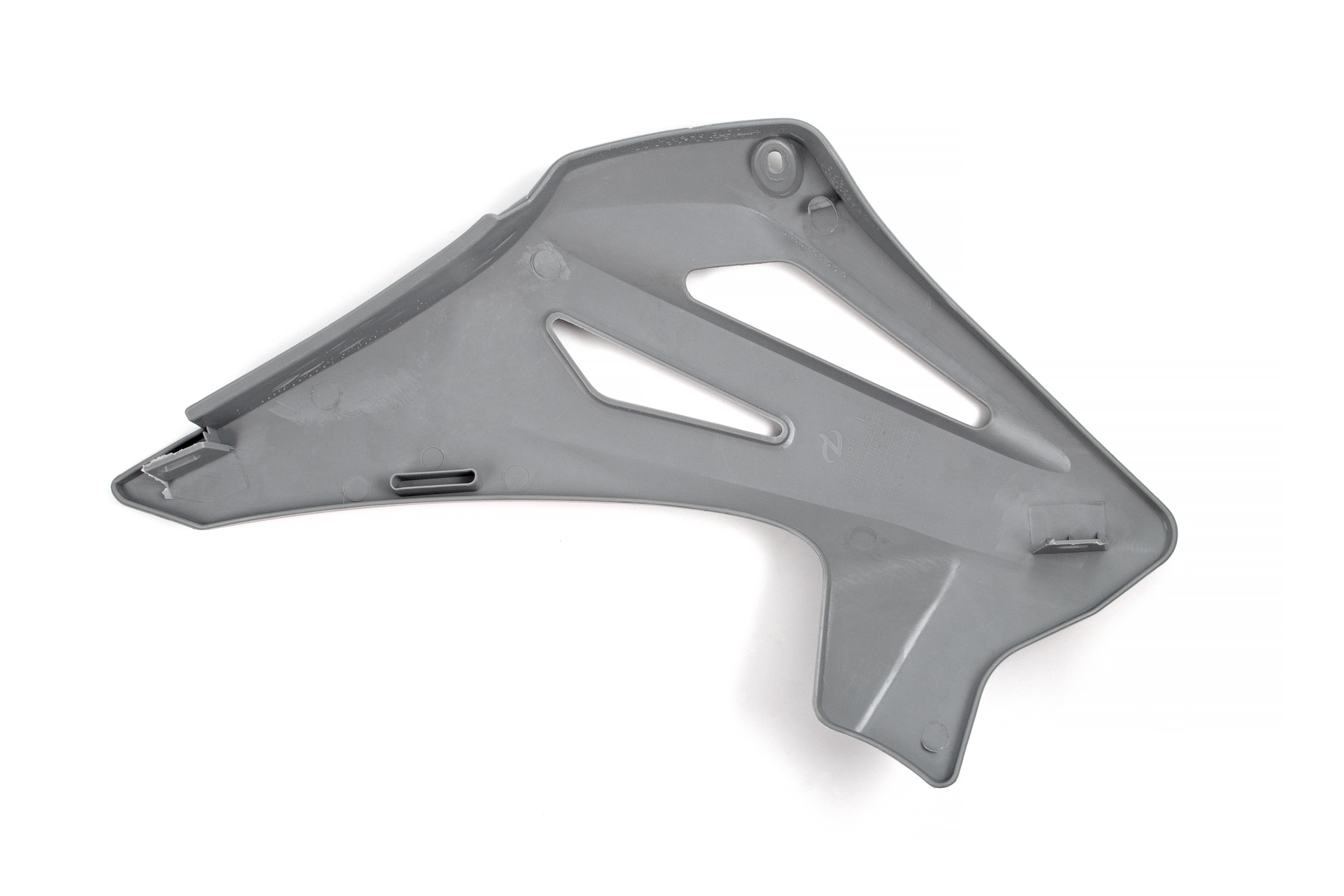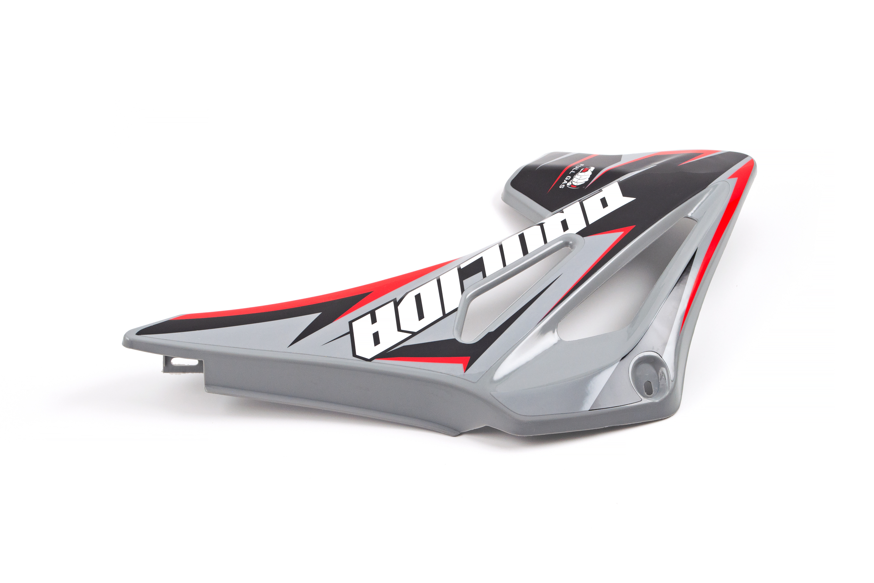 - Левый передний боковой обтекатель (также называемый пластиком бака или защитой радиатора) базового серого цвета. Эта кузовная деталь формирует узнаваемый силуэт мотоцикла, направляет встречные потоки воздуха для эффективного охлаждения двигателя и защищает топливный бак от механических повреждений. Главная особенность данной позиции — деталь поставляется с уже нанесенной плотной графикой заводского качества.