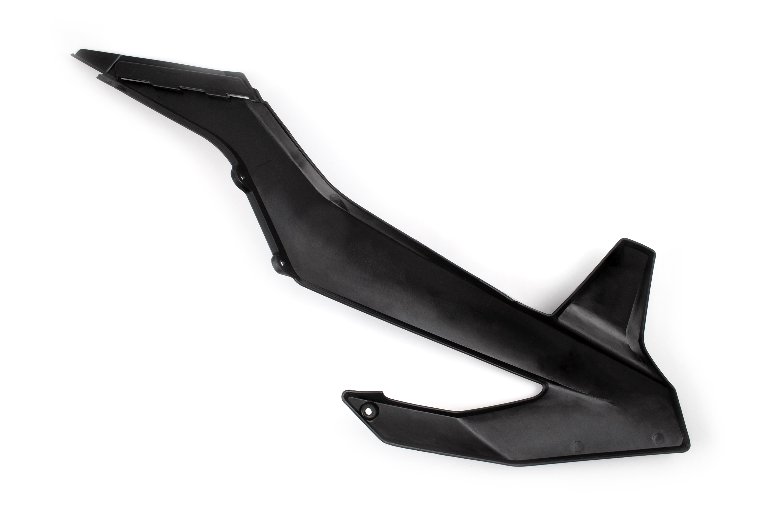 Внутренние ребра жесткости направляют воздух прямо в радиатор. Внешняя геометрия пластика спроектирована так, чтобы райдеру было удобно плотно сжимать мотоцикл коленями при езде в стойке.