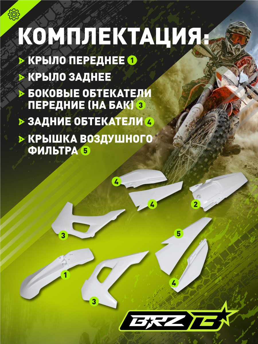Комплект пластика для BRZ H6, белый цвет. Дизайн выполнен в стиле Husqvarna, что придаёт мотоциклу современный и узнаваемый внешний вид. Комплект не имеет аналогов — является уникальной разработкой для данной модели, идеально подгоняется по геометрии и креплениям к раме BRZ H6. Пластик высокопрочный, устойчив к ударам, ультрафиолету и истиранию, рассчитан на эксплуатацию в самых разных условиях (эндуро, мотокросс, экстремальные поездки).