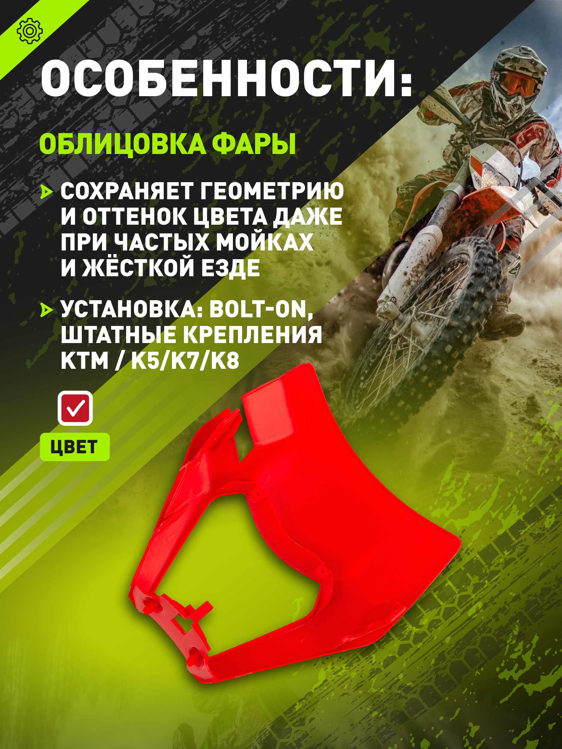 - Облицовка фары красного цвета для мотоциклов BRZ X5-X6-X8, Progasi, Gr8 и Kews K16. Является аналогом оригинальной детали KTM с артикулом 79708001000. Изготовлена из ударопрочного пластика. Выполняет функции крепления и защитного корпуса фары. Прямая установка без доработок.