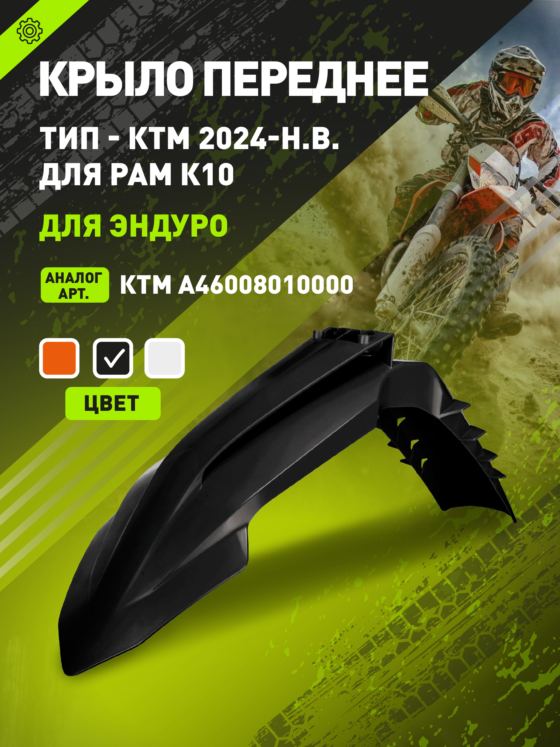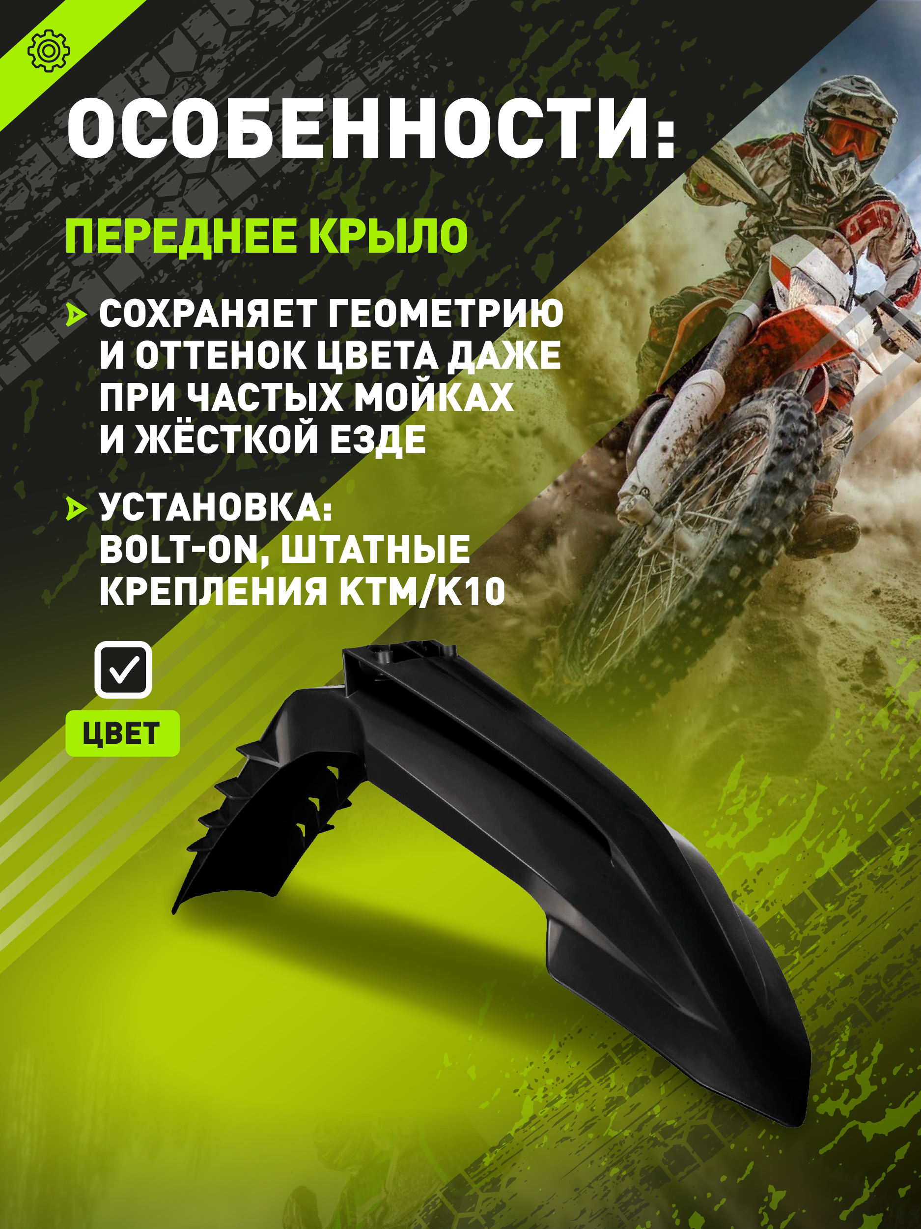 - Чёрное переднее крыло для мотоциклов на базе KTM 2024 года и аналогичных китайских моделей с рамой K10. Выполнено из прочного ударостойкого пластика типа KTM 24г. Эффективно защищает от грязи, воды и камней, подходит для установки на штатные крепления без доработок.